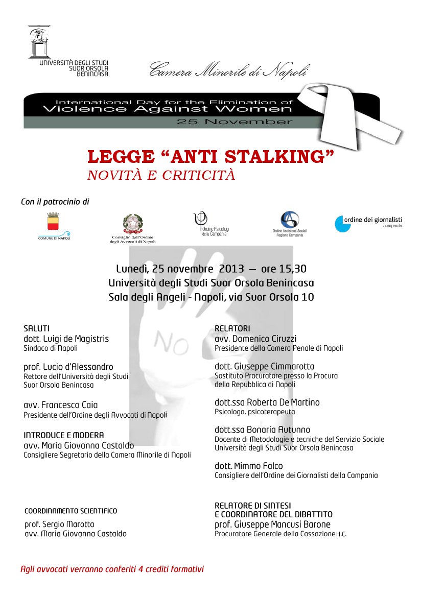 Lunedì 25 Novembre alle ore 15.30 presso la Sala degli Angeli dell’Università Suor Orsola Benincasa di Napoli si svolgerà il convegno dedicato al tema “Legge anti stalking: novità e criticità”.