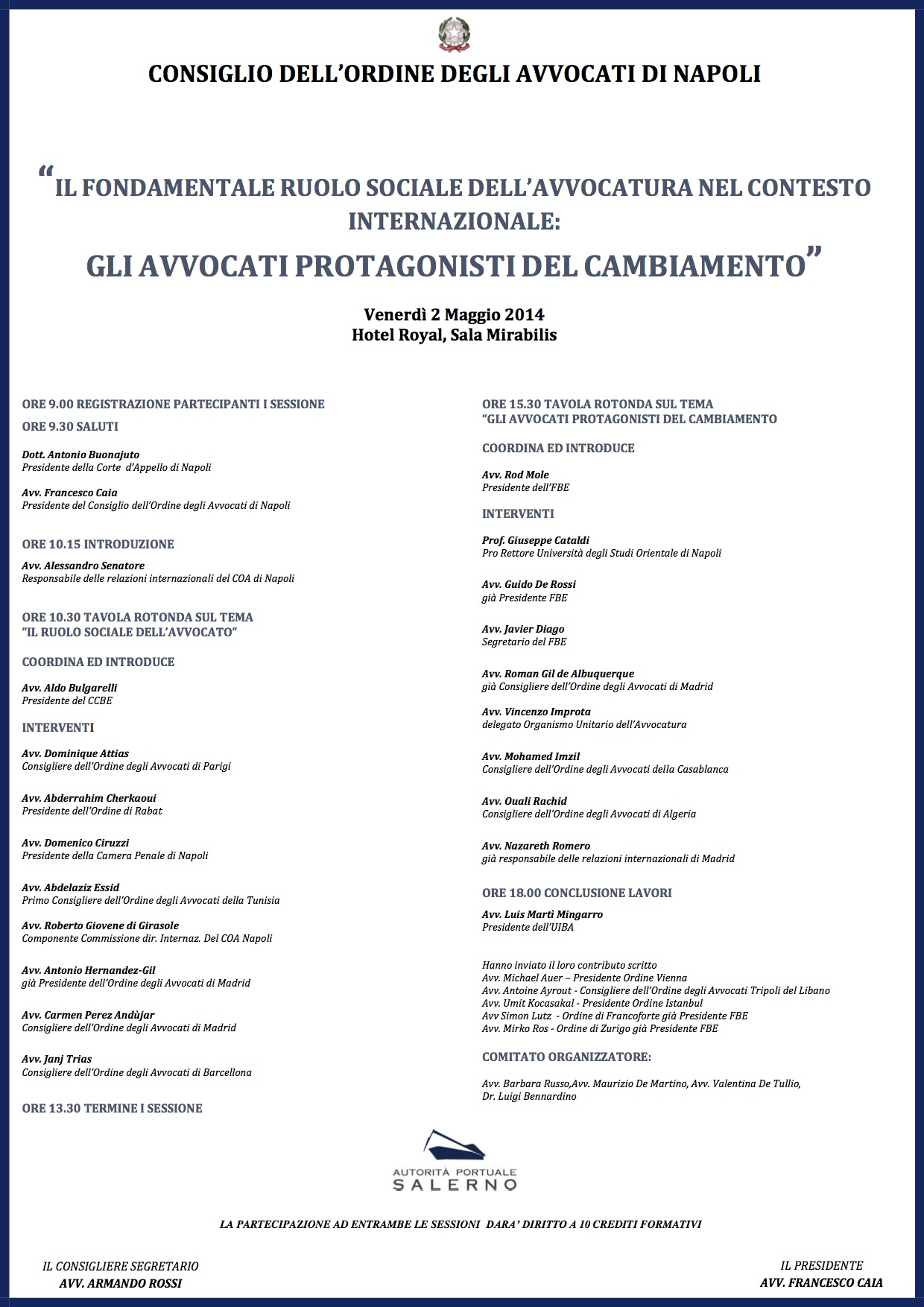L’incontro del 2 maggio è di grande importanza, è un momento di confronto con l’avvocatura europea, iberoamericana e maghrebina, per affrontare, in una logica finalmente internazionale, i temi del ruolo e della figura dell’Avvocato in questa società globalizzata e i problemi della tutela dei diritti.