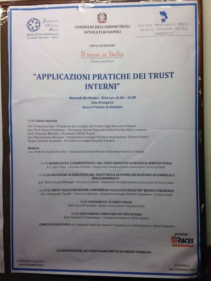 Si aprono i lavori con i saluti del Presidente dell’Ordine degli Avvocati di Napoli, F.Caia. L’evento, organizzato dalla Fondazione Odcec Napoli, dall’Unione Regionale degli Ordini Forensi della Campania e dal Consiglio dell’Ordine degli Avvocati di Napoli, moderato dall’Avv. Prof. F. Bocchini, affronta il delicato tema del ‘trust interno’, quale strumento di tutela a favore dei ‘soggetti deboli’. Un atto istitutivo, un negozio unilaterale programmatico posto in atto dal disponente in favore di un soggetto determinato, al fine di vincolare determinati beni.
