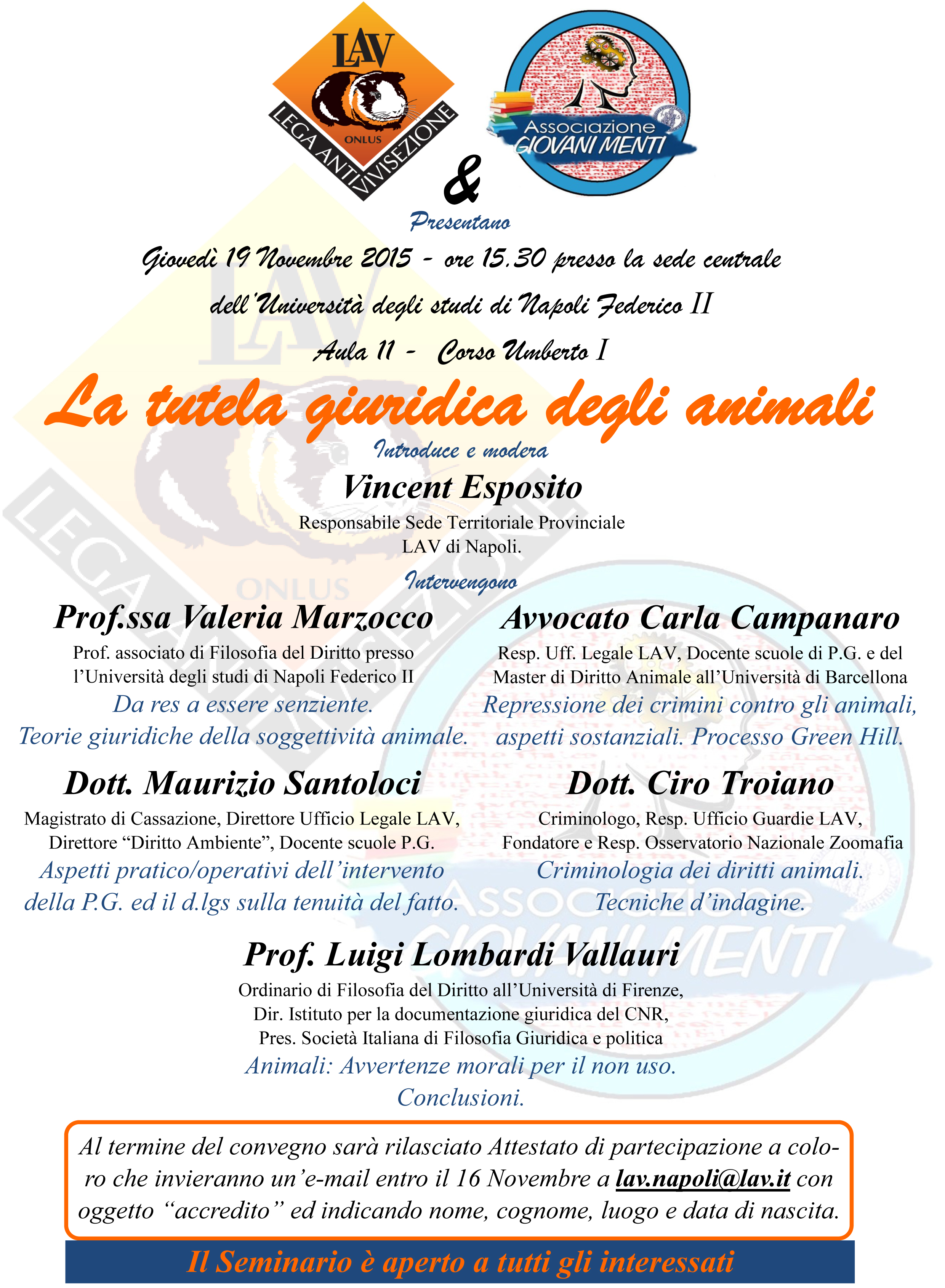 L’evento, moderato da Vincent Esposito (Responsabile Sede Territoriale Provinciale LAV di Napoli), vedrà la partecipazione della Prof.ssa Valeria Marzocco (Professore associato di Filosofia del Diritto all’Università degli Studi di Napoli Federico II e fervente antispecista), dell’Avv. Carla Campanaro (Responsabile Ufficio Legale LAV, docente presso diverse Scuole statali e locali di polizia, docente al Master di Diritto Animale dell’Università di Barcellona), del Dott. Maurizio Santoloci (Magistrato di Cassazione, Direttore Ufficio Legale LAV, Direttore testata giornalistica “Diritto Ambiente”, docente presso diverse Scuole statali e locali di polizia), del Dott. Ciro Troiano (Criminologo, fondatore e responsabile dell’Osservatorio Nazionale Zoomafia, responsabile Ufficio Guardie LAV) e del Prof. Luigi Lombardi Vallauri (Ordinario di Filosofia del diritto all’Università di Firenze e noto sostenitore dei diritti animali. Direttore dell’Istituto per la documentazione giuridica del CNR, Presidente della Società italiana di filosofia giuridica e politica.)