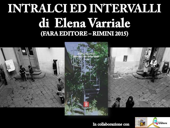 Venerdì 4 dicembre 2015, ore 16.00, presso il Dipartimento di Scienze Sociali dell’Università Federico II, si presenterà “Intralci ed intervalli” (edito da Fara Editore – Rimini 2015), il nuovo libro della scrittrice poeta Elena Varriale. Interverranno la Prof.ssa Enrica Amaturo, Direttrice del Dipartimento di Scienze sociali dell’Università di Napoli Federico II, il Prof. Luigi Caramiello, professore di Sociologia dell’Arte e della Letteratura, Ottavio Rossani, giornalista poeta, e l’avv. Vincenzo Pecorella, Consigliere dell’Ordine degli Avvocati di Napoli.Letture a cura di Camilla Aiello, avvocato attrice. Modera Argia di Donato.Elena Varriale è nata a Napoli, terra di mare e fuoco e nell’aria che respira ci sono oracoli di Sibilla e canti di Sirene. Ha pubblicato articoli, saggi e due raccolte di poesie (Lo so che sbaglio, Tracce 2007, e Solubile Scompiglio, Tindari Edizioni 2012). Suoi scritti (poesie e racconti) sono stati selezionati e pubblicati in antologie e riviste (Aletti, Giulio Perrone Editore, Lietocolle, Fara, Limina Mentis) e nel blog di Poesia Rai News curato da Luigia Sorrentino. Ha ricevuto riconoscimenti in premi letterari nazionali e internazionali. Il suo romanzo breve Se sei nato caos non puoi diventare armonia è stato pubblicato nell’antologia Faraexcelsior 2013. Il suo scritto “La parola è un silenzio abitato” è inserito ne ”Il luogo della parola”.