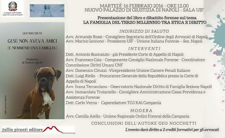 Questi i temi, ancorché assunti, dell’ultimo libro di Geo Nocchetti, “Gesù non aveva amici (e nemmeno una famiglia)”, edito da Tullio Pironti, al centro del dibattito tenutosi martedì 16 febbraio, presso il Tribunale di Napoli, Sala UIF, proposto dal Consiglio dell’Ordine degli Avvocati di Napoli in collaborazione con L’Unione Italiana Forense (UIF) – Sez. Napoli. All’incontro hanno partecipato l’avv. Armando Rossi, nuovo Presidente dell’Ordine degli Avvocati di Napoli, l’avv. Marino Iannone, Presidente UIF – Sez. Napoli, il dott. Luigi Riello Procuratore Generale della Repubblica della CDA Napoli, l’avv. Francesco Caia, Componente Consiglio Nazionale Forense e Coordinatore Commissione Diritti Umani CNF, l’avv. Domenico Ciruzzi, Vicepresidente Unione Camere Penali Italiane, l’avv. Immacolata Troianiello, Presidente Comitato Pari Opportunità Napoli, il dott. Antonio Buonaiuto già Presidente CDA Napoli e l’avv. Ivana, Terracciano, Presidente Osservatorio Diritto di Famiglia Napoli.