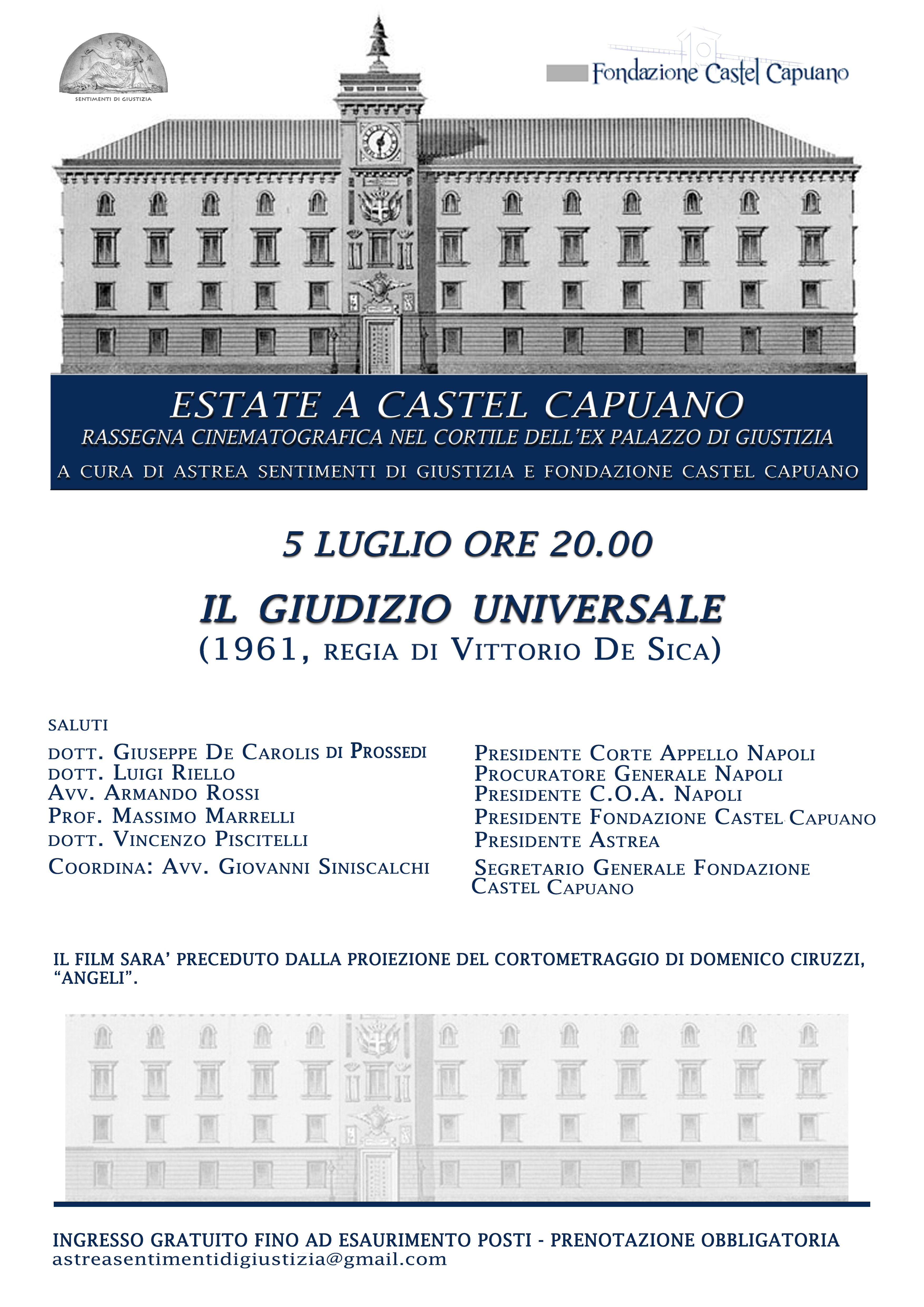 La prima delle tre serate prevede la programmazione de“Il Giudizio universale”, di Vittorio De Sica, preceduto dalla proiezione del cortometraggio “Angeli”, dell’avv. Domenico Ciruzzi.