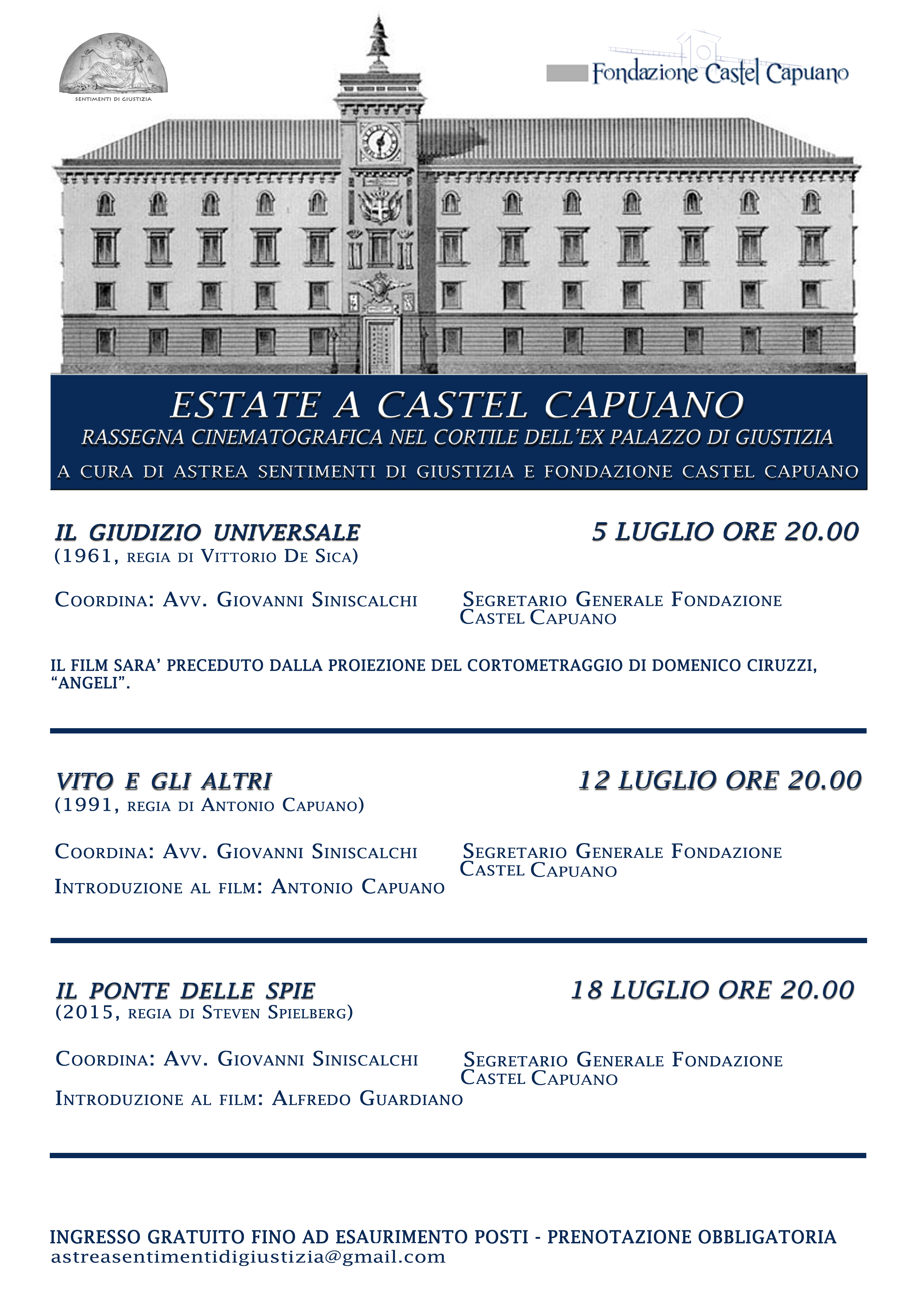 L’Associazione “Astrea Sentimenti di Giustizia” unitamente alla Fondazione Castel Capuano, propone una rassegna cinematografica diluita in tre appuntamenti che si terrà nel suggestivo cortile del Castello.
