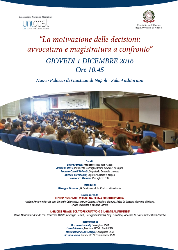 Napoli. Nuovo Palazzo di Giustizia. Sala Auditorium. Giovedì 1 dicembre alle ore 10:45, si terrà il Convegno “LA MOTIVAZIONE DELLE DECISIONI: AVVOCATURA E MAGISTRATURA A CONFRONTO” organizzato dal Centro Studi Nino Abate in sinergia con l’UNICOST Associazione Nazionale Magistrati e con il Consiglio dell’Ordine degli Avvocati di Napoli. L’evento prevede i saluti di Ettore Ferrara – Presidente Tribunale Napoli, Armando Rossi – Presidente del Consiglio dell’Ordine degli Avvocati di Napoli, Roberto Carrelli Palombi– Segretario Genrale Unicost, Michele Ciambellini – Segretario Unicost Napoli, Francesco Cananzi – Consigliere CSM. Introduce Giuseppe Tesauro, già Presidente della Corte Costituzionale.