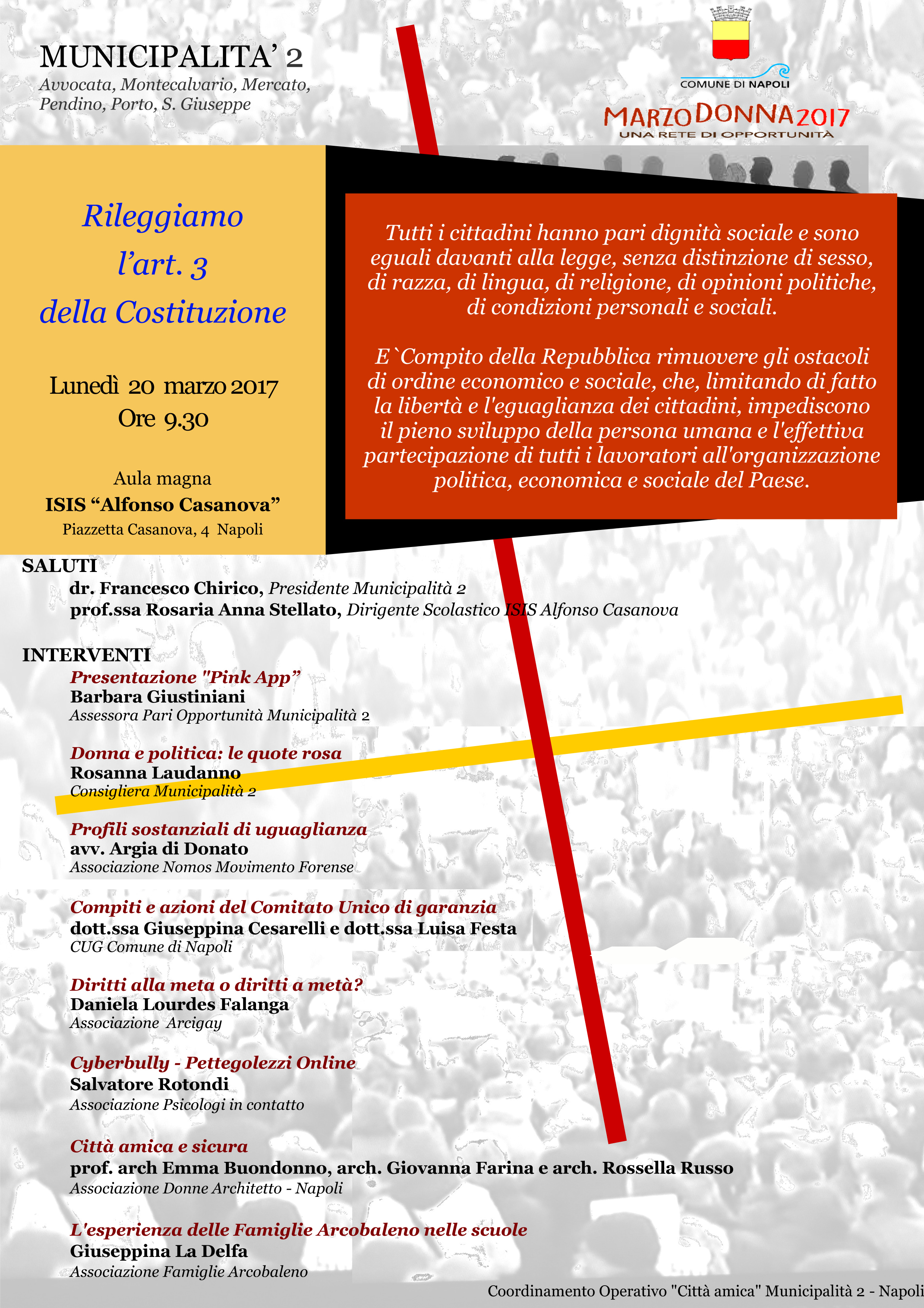 Lunedì 20 marzo, a partire dalle ore 9:30 presso l’Aula magna dell’Isis “Alfonso Casanova” (Piazzetta Casanova, 4 – Napoli), si terrà il convegno “Rileggiamo l’art. 3 della Costituzione” organizzato dalla 2° Municipalità del Comune di Napoli. L’evento si inserisce nell’ambito di “Marzo Donna 2017, una rete di opportunità”, una serie di incontri e di attività rivolte a Scuole, Associazioni e cittadini per riflettere sul significato della “Festa della Donna” e per offrire spazi e luoghi di confronto per favorire il dibattito sul tema delle pari opportunità.
