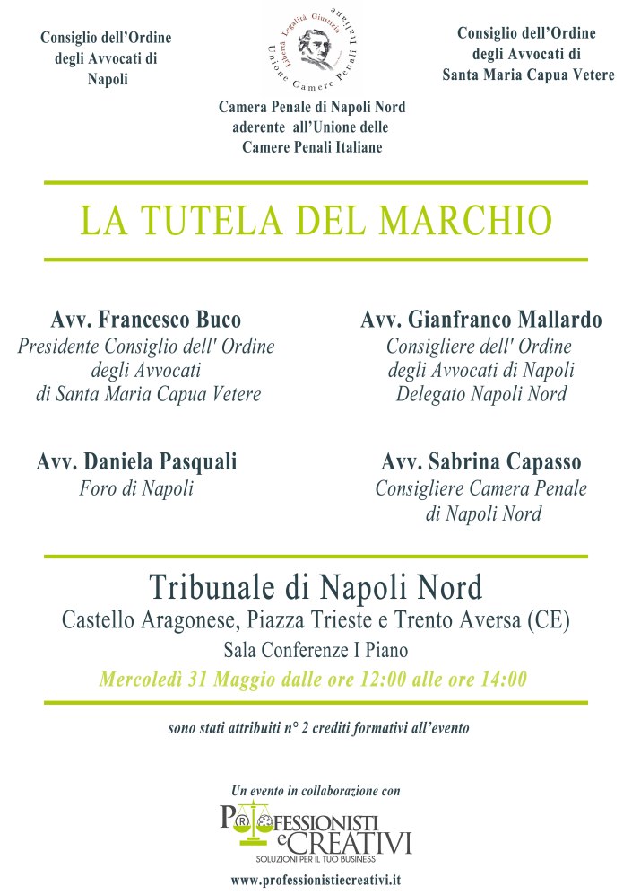 Questa mattina, alle ore 12,00, presso il Tribunale di Napoli Nord (Aversa) si terrà il Convegno “La tutela del marchio” organizzato dal Consiglio dell’Ordine degli Avvocati di Napoli e dal Consiglio dell’Ordine degli Avvocati di Santa Maria Capua Vetere, in collaborazione con la Camera Penale di Napoli Nord e con Professionisti e creativi.