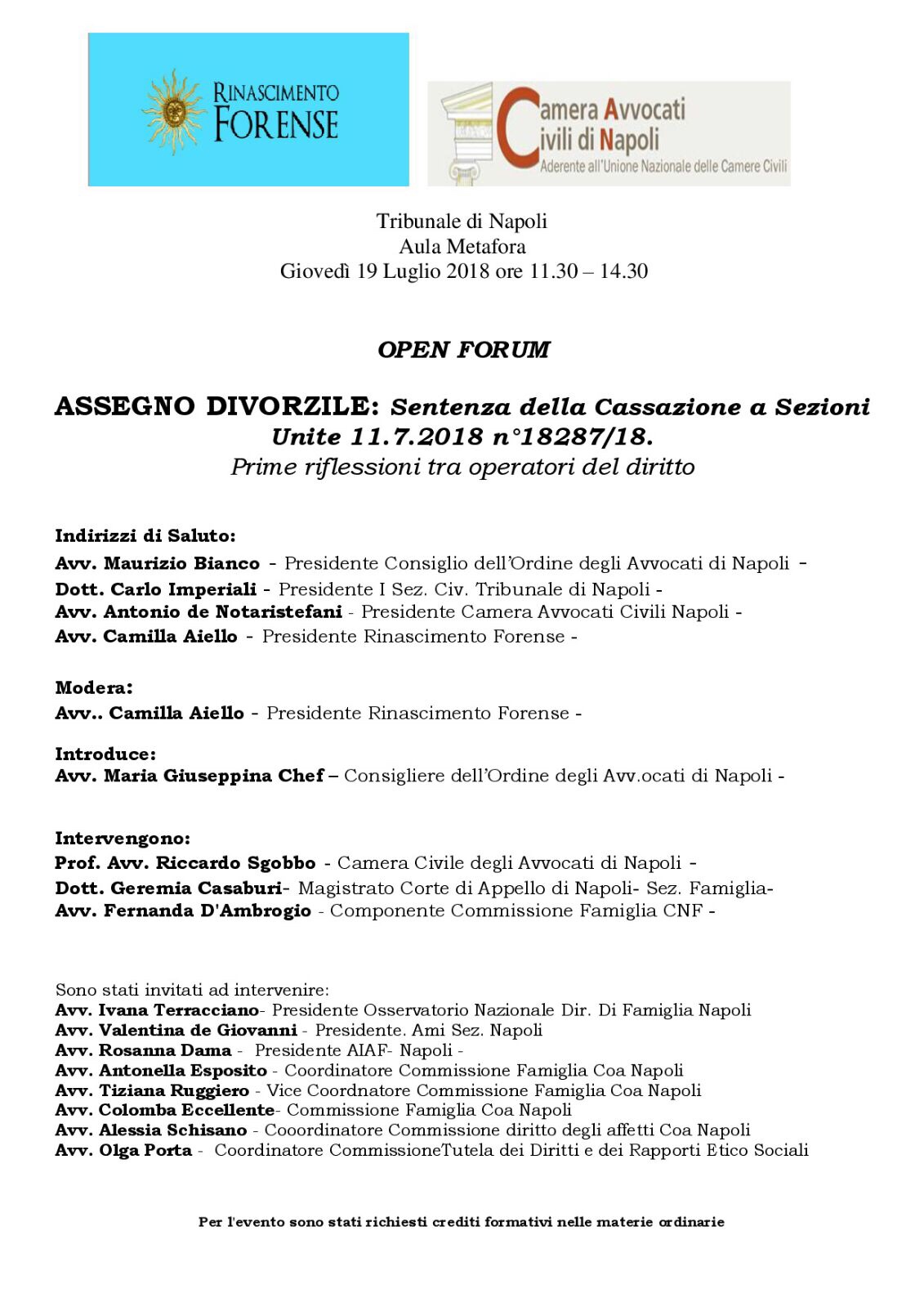 Ad aprire i lavori dell’Open Forum, – a seguito dei tradizionali indirizzi di saluto da parte degli avvocati Aiello e de Notaristefani (presidenti delle associazioni promotrici del Forum), del Dott. Carlo Imperiali, Presidente della I sez Civile del Tribunale di Napoli e dell’avv. Maurizio Bianco, Presidente dell’Ordine degli Avvocati di Napoli – l’avv. Maria Giuseppina Chef, Consigliere dell’Ordine degli Avvocati di Napoli, che introdurrà, – evidenziando gli aspetti connessi alla recentissima sentenza dell’11 luglio u.s., e alla risoluzione che tale pronuncia fornisce rispetto ad un contrasto giurisprudenziale sul tema dell’assegno divorzile – gli interventi dell’avv. Riccardo Sgobbo, membro della Camera Civile degli Avvocati di Napoli, del Dott. Geremia Casaburi, Magistrato di Corte di Appello di Napoli – Sez. Famiglia, e dell’avv. Fernanda D’Ambrogio, componente commissione Famiglia CNF.