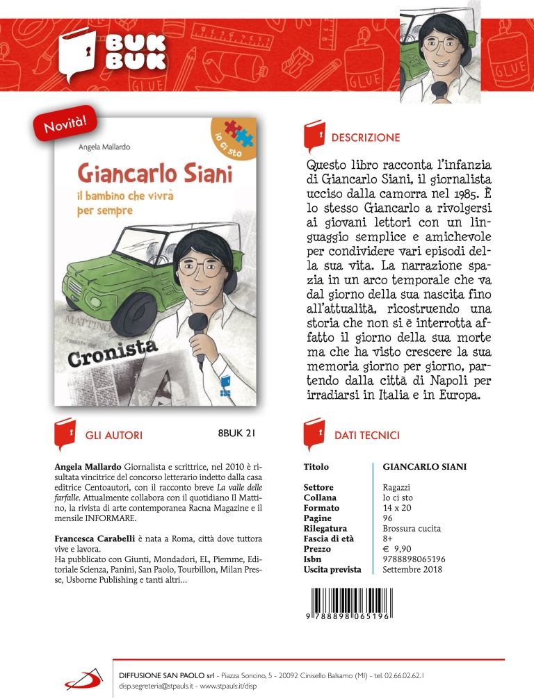 Un percorso narrativo per bambini di educazione alla legalità e alla cittadinanza consapevole attraverso l’esempio di Giancarlo Siani, il giornalista napoletano de “Il Mattino” brutalmente ucciso il 23 Settembre del 1985 in un agguato di camorra. L’idea originale e quanto mai efficace è contenuta nel volume “Giancarlo Siani. Il bambino che vivrà per sempre”(Buk Buk Editore, 2018) di Angela Mallardo, giornalista, scrittrice ma soprattutto‘maestra’ di lungo corso oggi insegnante presso il 2°Circolo didattico “Giancarlo Siani” di Mugnano di Napoli dove ha progettato e coordinato numerose attività di educazione ambientale e di inclusione sociale e dove attualmente è la referente alla Legalità e responsabile della Valutazione.