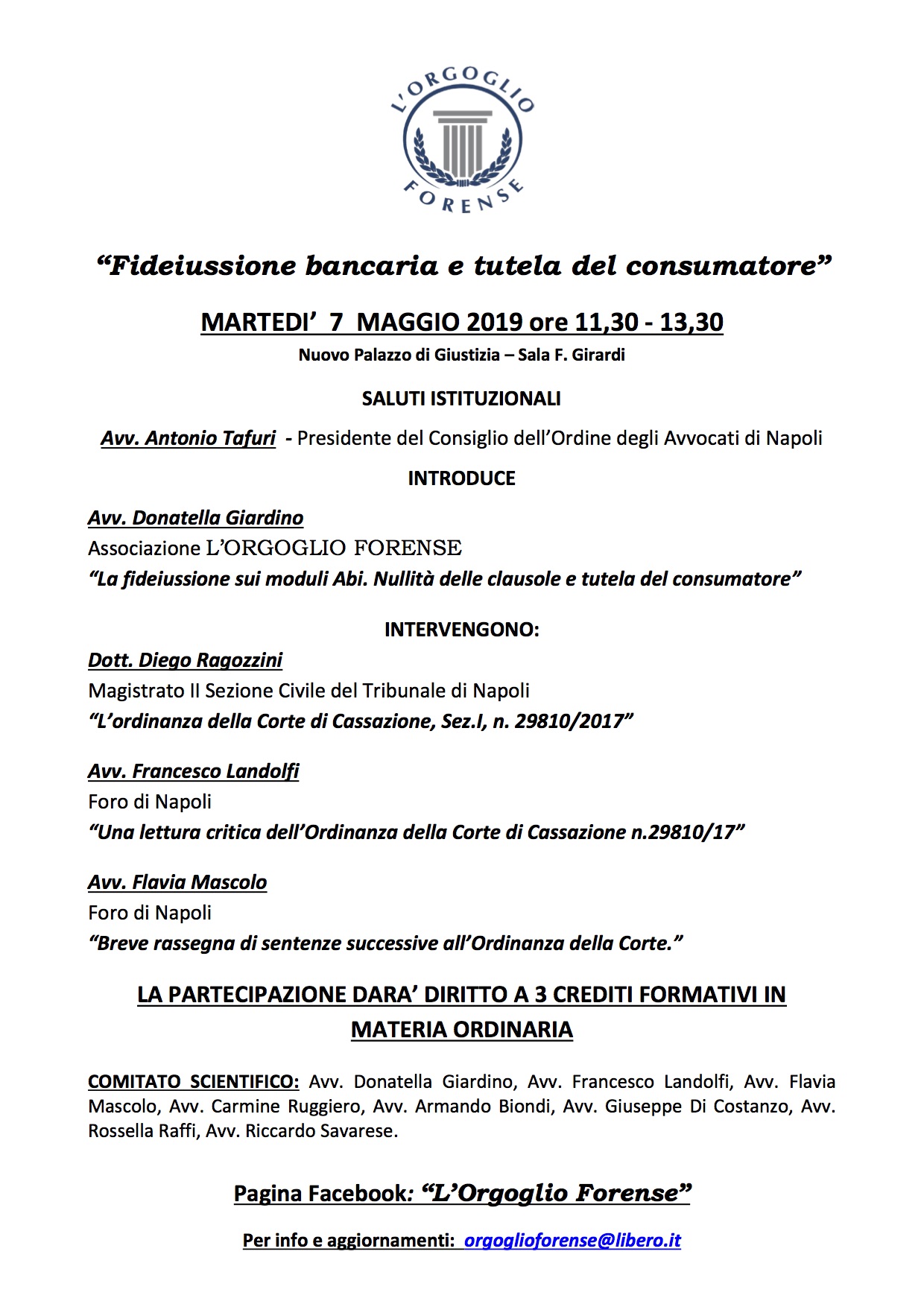 Napoli. Martedì 7 maggio, dalle h. 11,30 alle h.13,00, presso l’Aula F. Girardi – Nuovo Palazzo di Giustizia (NA) si svolgerà l’incontro “Fideiussione Bancaria e Tutela del Consumatore”, ideato e promosso dall’associazione L’Orgoglio Forense con il patrocinio del Consiglio dell’Ordine degli Avvocati di Napoli.