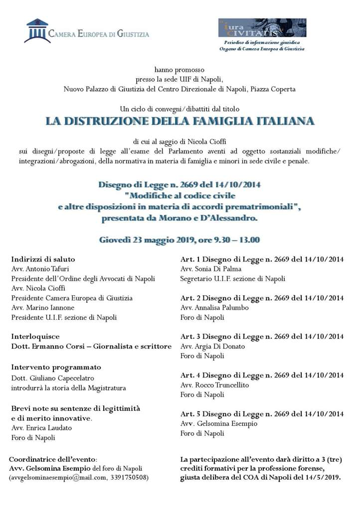 Napoli. Giovedì 23 maggio, dalle ore 9.30 alle ore 13.00, presso la sede UIF di Napoli (Nuovo Palazzo di Giustizia del Centro Direzionale di Napoli, Piazza Coperta) si svolgerà il secondo incontro del ciclo di conferenze “LA DISTRUZIONE DELLA FAMIGLIA ITALIANA” concepite per riflettere e confrontarsi sui disegni e sulle proposte di legge all’esame del Parlamento, aventi ad oggetto le modifiche ed integrazioni della normativa in materia di famiglia e minori in sede civile e penale: gli eventi sono organizzati dall’Associazione “Camera Europea di Giustizia” e da “Iura civitatis periodico di informazione giuridica”, coordinati dall’avv. Gelsomina Esempio (Foro di Napoli).