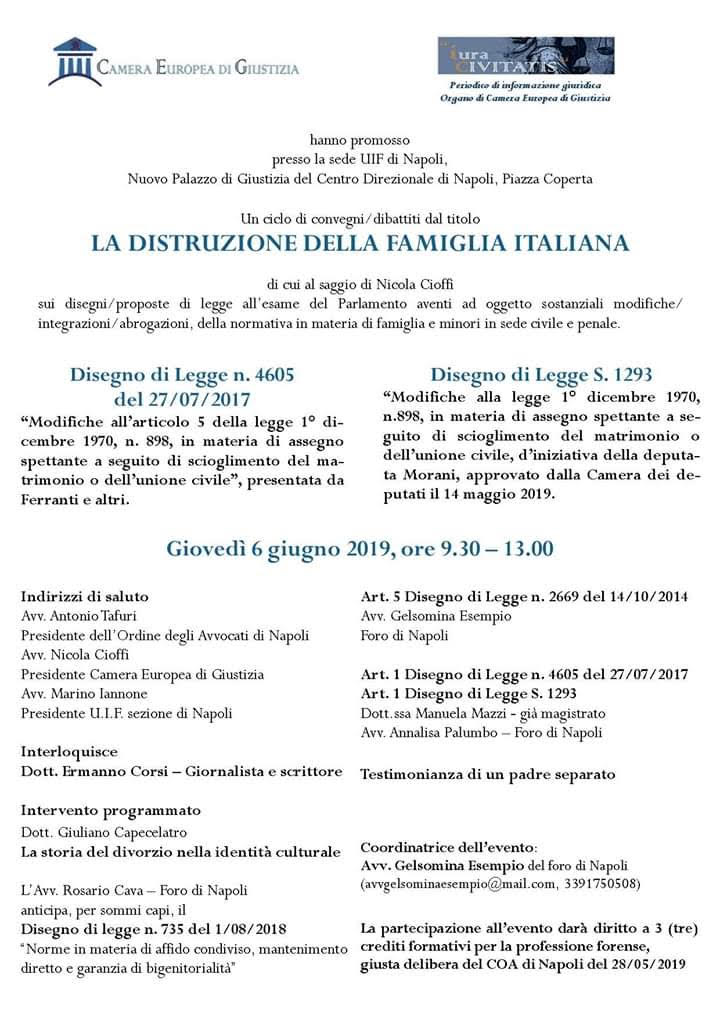 Napoli.Giovedì 06 giugno, dalle ore 9.30 alle ore 13.00, presso la sede UIF di Napoli (Nuovo Palazzo di Giustizia del Centro Direzionale di Napoli, Piazza Coperta) si svolgerà il terzo incontro del ciclo di conferenze “LA DISTRUZIONE DELLA FAMIGLIA ITALIANA” ideate e organizzate per riflettere e confrontarsi sui disegni e sulle proposte di legge all’esame del Parlamento, aventi ad oggetto le modifiche ed integrazioni della normativa in materia di famiglia e minori in sede civile e penale: gli eventi sono organizzati dall’Associazione “Camera Europea di Giustizia” e da “Iura civitatisperiodico di informazione giuridica”, coordinati dall’avv. Gelsomina Esempio (Foro di Napoli).