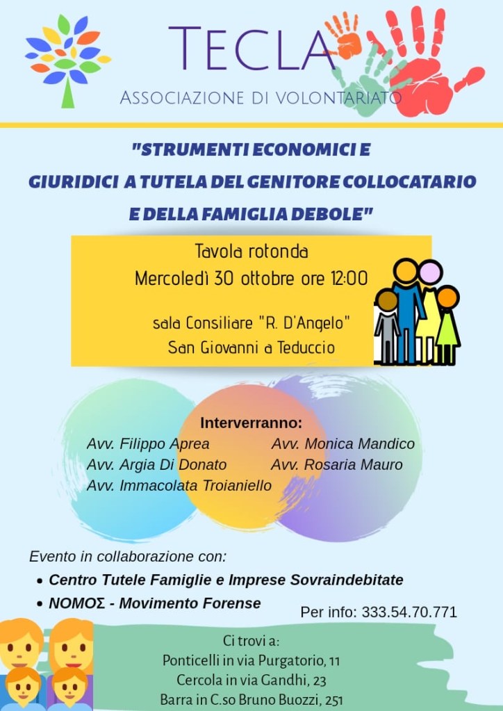 La Tavola rotonda “Strumenti economici e giuridici a tutela del genitore collocatario e della famiglia debole” promossa dall’Associazione di volontariato Tecla in collaborazione con il Centro tutele Famiglie e imprese Sovraindebitate e NOMOΣ Movimento Forense, vuole essere un momento di confronto ma anche di informazione sui mezzi a disposizione delle famiglie per l’erogazione di prestazioni a carattere economico ed assistenziale, nonché come momento di raccordo informativo sulle possibilità ed alternative di cui dispone il genitore presso il quale vivono i figli – in caso di separazione e/o divorzio – per poter avere soddisfazione delle proprie ragioni.