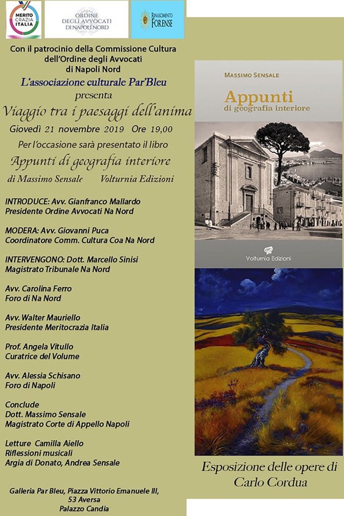Giovedì 21 novembre alle ore 19,00 presso la Galleria d’Arte Par’Bleu (Palazzo Candia – Piazza Vittorio Emanuele III, Aversa) si svolgerà l’evento “Viaggio tra i paesaggi dell’anima” organizzato dall’Associazione Par’Bleu con il patrocinio del Consiglio dell’Ordine degli Avvocati di Napoli Nord e della Commissione Cultura dell’Ordine degli Avvocati di Napoli Nord e delle associazioni Rinascimento Forense e Meritocrazia Italia.