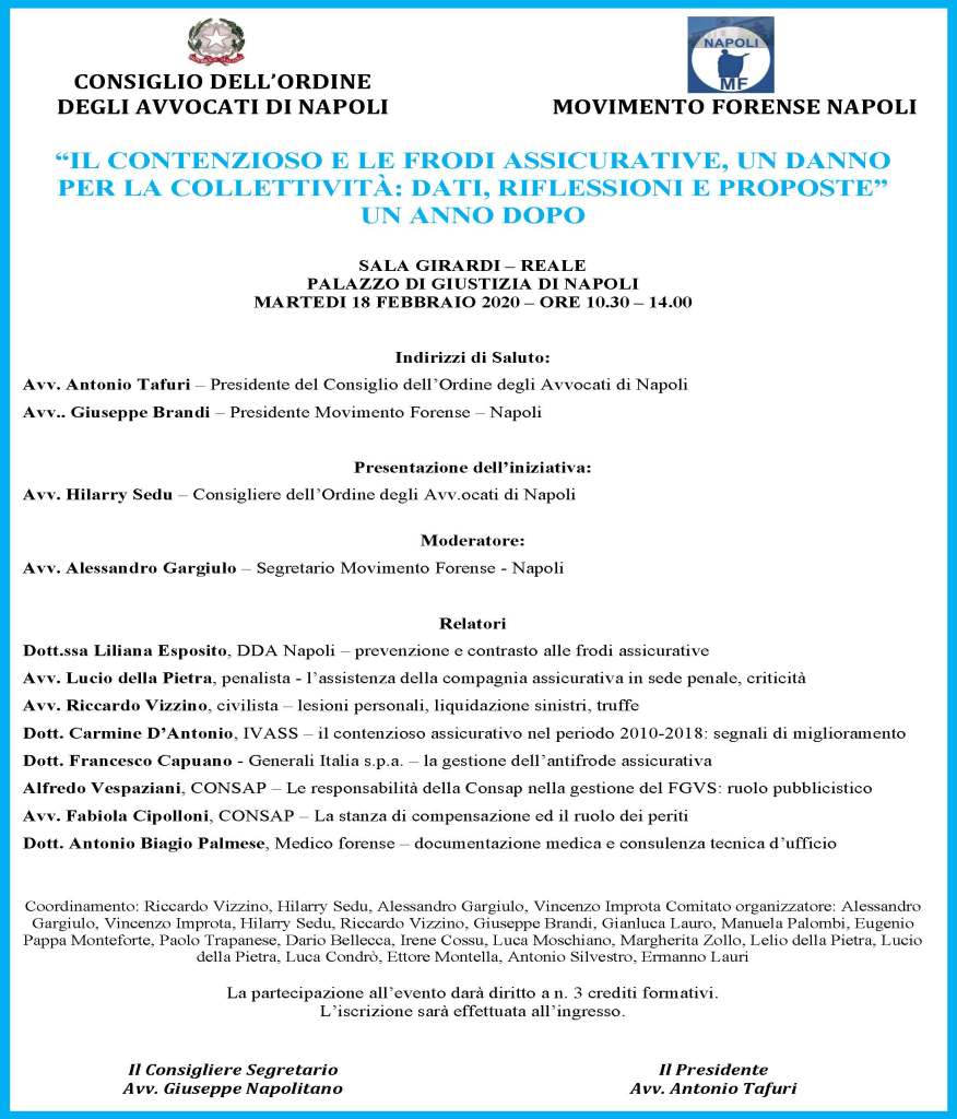 L’evento, – con i saluti dell’avv. Antonio Tafuri, Presidente del Consiglio dell’Ordine degli Avvocati di Napoli e dell’avv. Giuseppe Brandi, Presidente Movimento Forense – Napoli e l’introduzione dell’avv. Hillary Sedu, Consigliere dell’Ordine degli Avvocati di Napoli, sarà moderato dall’avv. Alessandro Gargiulo, Segretario Movimento Forense – Napoli e prevede gli interventi della dott.ssa Liliana Esposito, DDA Napoli, dell’avv. Lucio della Pietra, dell’avv. Riccardo Vizzino, del dott. Carmine D’Antonio, IVASS, del dott. Francesco Capuano, Generali Italia s.p.a., di Alfredo Vespaziani, CONSAP, dell’avv. Fabiola Cipolloni, CONSAP e del dott. Antonio Biagio Palmese, Medico forense.