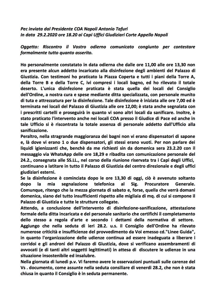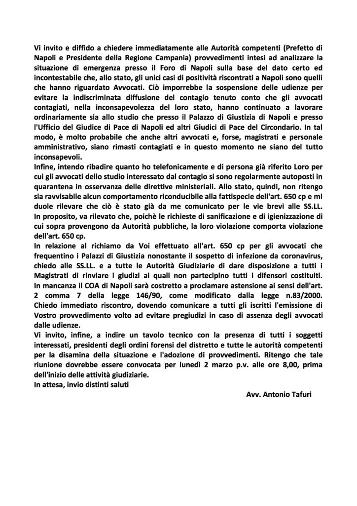 A seguito del primo caso di Coronavirus (Covid19) in Campania – che vedrebbe protagonista proprio un avvocato napoletano – scatta l’allarme dei legali partenopei che richiedono la sospensione delle attività giudiziarie. Successivamente alla nota della Corte d’Appello e del Procuratore Generale nella quale si evidenziano le misure di prevenzione e linee per limitare il contagio, il Consiglio dell’Ordine degli Avvocati di Napoli – riunito in seduta permanente da due giorni per trovare soluzioni che possano contenere il problema che nasce dalla possibilità di contrarre il virus, transitando nelle aule e nei locali del Palazzo di Giustizia – , venerdì 28 febbraio diffida “a sospendere immediatamente tutte le attività giudiziarie attualmente in corso, fino a quando non saranno, nel rispetto delle ordinanze indicate in premessa, effettuate tutte le attività di disinfezione, ordinarie e straordinarie, dei locali sedi di Palazzi di Giustizia rientranti nella loro competenza, nonché posizionati dispensatori di disinfettante o antisettico per le mani.” I provvedimenti di disinfestazione previsti di fatto non vengono adottati (nella giornata di sabato e di domenica la disinfestazione nei locali del Palazzo di giustizia sono state effettuate da personale specializzato a cura del Consiglio dell’Ordine degli Avvocati di Napoli) e ciò causa la forte reazione del Consiglio (di seguito la risposta del Presidente del Consiglio dell’Ordine degli Avvocati di Napoli, Avv. Antonio Tafuri),
