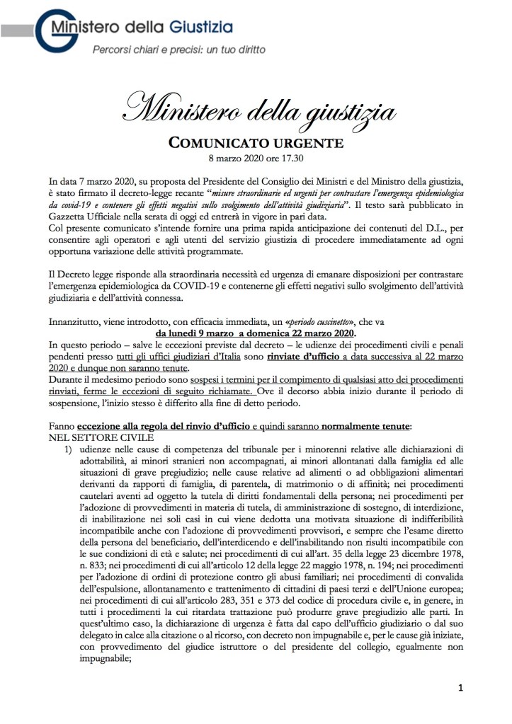 Di qualche ora, il comunicato stampa del Ministero di Giustizia con il quale si offre una rapida anticipazione dei contenuti del D.L. firmato in data 7 marzo e recante “misure straordinarie ed urgenti per contrastare l’emergenza epidemiologica da covid-19 e contenere gli effetti negativi sullo svolgimento dell’attività giudiziaria”, per consentire agli operatori e agli utenti del servizio giustizia di procedere immediatamente ad ogni opportuna variazione delle attività programmate. Il Decreto legge risponde alla straordinaria necessità ed urgenza di emanare disposizioni per contrastare l’emergenza epidemiologica da COVID-19 e contenerne gli effetti negativi sullo svolgimento dell’attività giudiziaria e dell’attività connessa. Viene introdotto, con efficacia immediata, un «periodo cuscinetto», che va da lunedì 9 marzo a domenica 22 marzo 2020. In questo periodo – salve le eccezioni previste dal decreto – le udienze dei procedimenti civili e penali pendenti presso tutti gli uffici giudiziari d’Italia sono rinviate d’ufficio a data successiva al 22 marzo 2020 e dunque non saranno tenute. Durante il medesimo periodo sono sospesi i termini per il compimento di qualsiasi atto dei procedimenti rinviati, ferme le eccezioni di seguito richiamate. Ove il decorso abbia inizio durante il periodo di sospensione, l’inizio stesso è differito alla fine di detto periodo.
