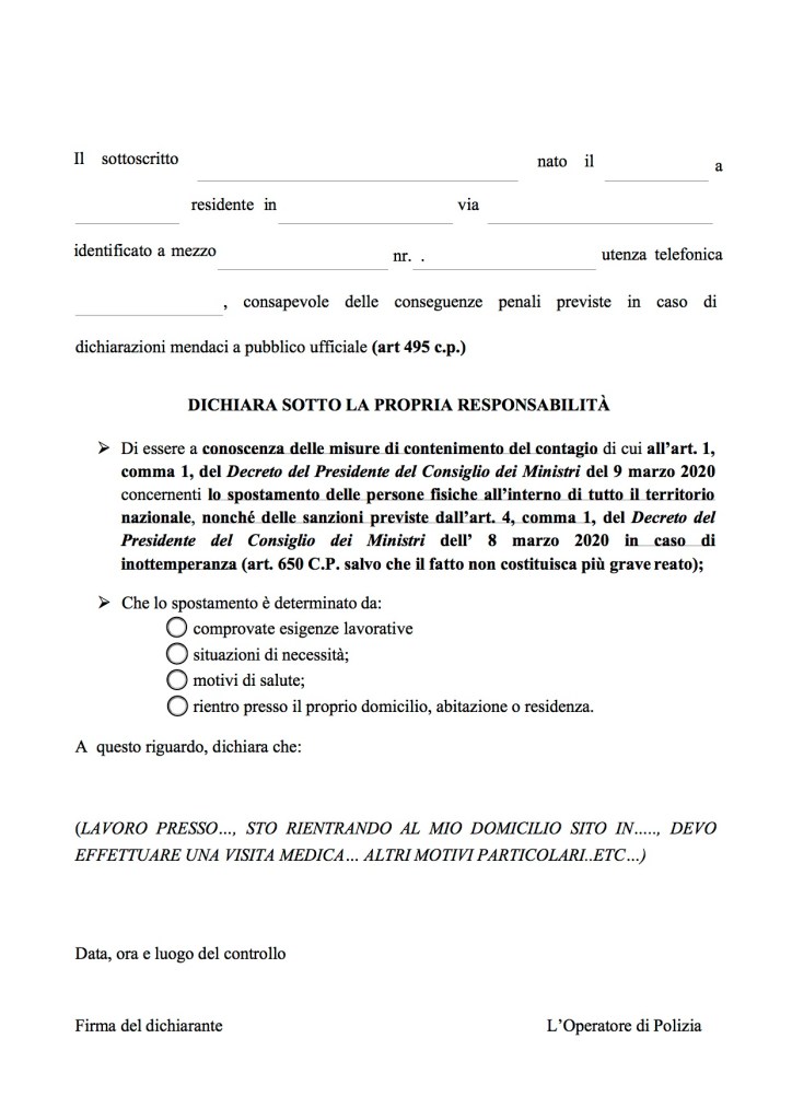 È fondamentale che queste eccezioni siano comprovate da una autocertificazione che va compilata e portata con sé, sia che si esca a piedi sia che si esca in macchina. Qui di seguito il link per scaricare il modulo ufficiale del Ministero https://www.interno.gov.it/sites/default/files/allegati/modulo_autodichiarazione_10.3.2020.pdf
