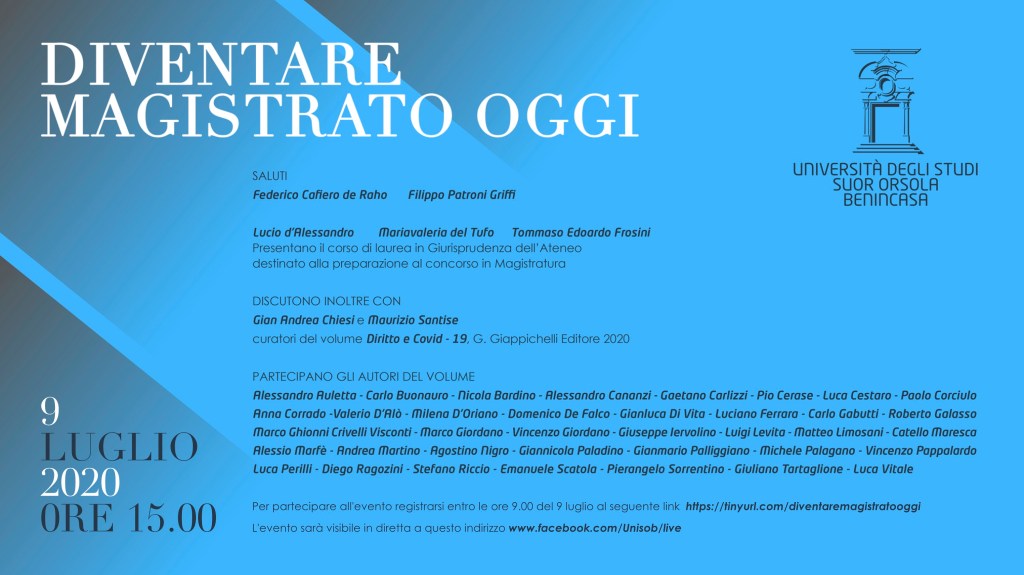 La presentazione del corso farà da anteprima ad un’ampia riflessione sui temi più attuali del diritto al tempo dell’emergenza Coronavirus organizzata con la presentazione in anteprima nazionale del volume “Diritto e Covid-19” (Giappichelli Editore) a cura dei magistrati Gian Andrea Chiesi e Maurizio Santise. Un volume che raccoglie gli interventi di giuristi e magistrati appartenenti a tutte le giurisdizioni con l’obiettivo di interrogarsi sui mutamenti del diritto conseguenti allo stato emergenziale dovuto alla recente pandemia. “Dal diritto civile al diritto penale, dal diritto amministrativo a quello tributario, passando attraverso il diritto processuale e quello sportivo, senza dimenticare il diritto sovranazionale, nessuna disciplina può dirsi immune agli effetti del Covid-19 – evidenzia Santise – e gli studiosi sono chiamati ad interrogarsi soprattutto sulla frenetica normativa esplosa in questi tempi valutando se sarà solo ‘diritto dell’urgenza’, destinato ad estinguersi con il cessare del momento di crisi o se darà lo spunto per una definitiva metamorfosi dell’ordinamento giuridico”.