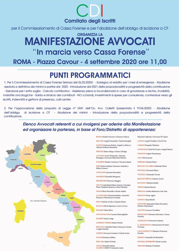 Il rigetto in prima istanza non ferma i ricorrenti e la contestazione prosegue il 4 settembre a Roma, in piazza Cavour, con una manifestazione nazionale (dalle h. 11,00 alle h. 13,30, all’aperto e con obbligo di mascherina e distanziamento fisico) organizzata dai 70 referenti del Comitato degli Iscritti a Cassa Forense (CDI) presenti nei vari Fori d’Italia, per chiedere l’approvazione della legge Colletti (che prevede l’abolizione dell’obbligo di iscrizione a Cassa Forense e il divieto di esigere contributi minimi o obbligatori non proporzionali al reddito) ed il Commissariamento dell’Ente.