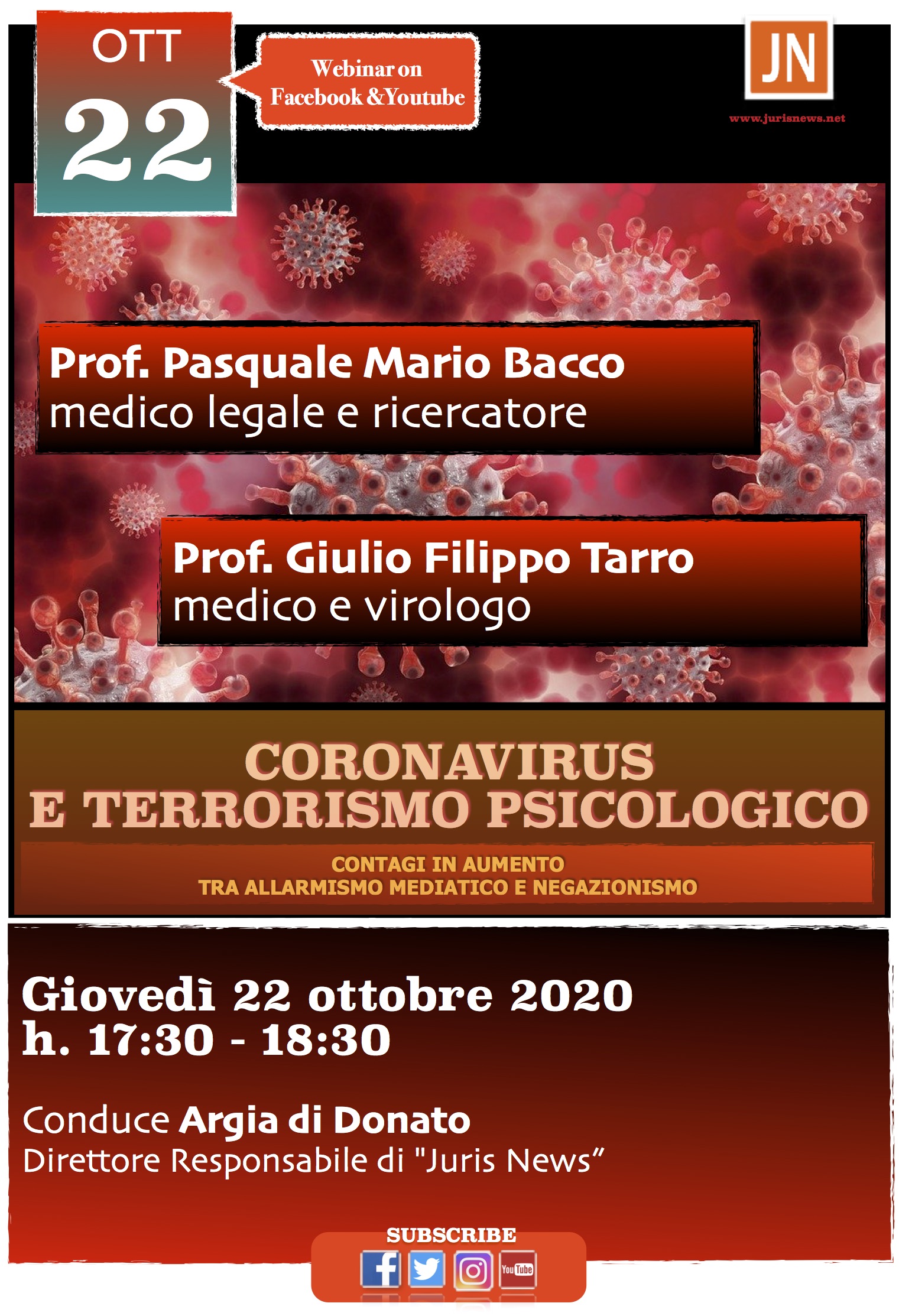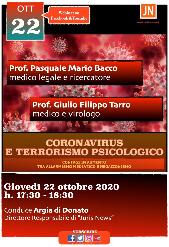Oggi a partire dalle h. 17,30 si svolgerà il webinar in diretta streaming YouTube e Facebook “Coronavirus e terrorismo psicologico. Contagi in aumento tra allarmismo mediatico e negazionismo.” con la partecipazione del Dott. Prof. Pasquale Mario Bacco, medico legale e ricercatore e del Dott. Prof. Giulio Tarro, medico e virologo.Conduce Argia di Donato, Drettore responsabile di Juris News.