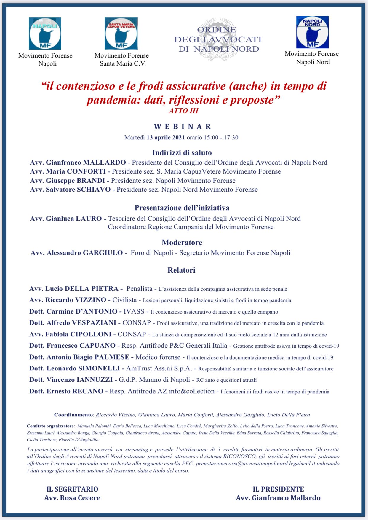 Martedì 13 aprile, a partire dalle h. 15,00 si svolgerà il webinar “Il contenzioso e le frodi assicurative (anche) in tempo di pandemia: dati, riflessioni e proposte – ATTO III”, organizzato dall’Ordine degli Avvocati di Napoli Nord e da tre sezioni del Movimento Forense, Napoli, Napoli Nord e Santa Maria Capua Vetere.