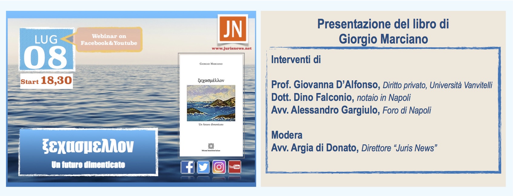 Interverranno la Prof.ssa Giovanna D’Alfonso, Diritto privato, Università Vanvitelli di Napoli, il Dott. Dino Falconio, notaio in Napoli e l’Avv. Alessandro Gargiulo, Foro di Napoli. Conclude l’autore, Giorgio Marciano.