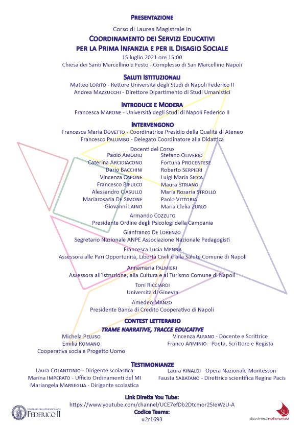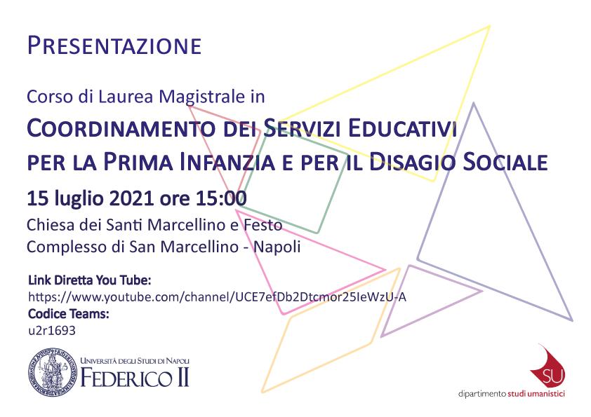 Napoli. Giovedì 15 luglio alle ore 15.00, presso la Chiesa dei Santi Marcellino e Festo, Complesso di San Marcellino, sarà presentato il Corso di Laurea Magistrale in Coordinamento dei Servizi Educativi per la Prima Infanzia e per il Disagio Sociale, di nuova attivazione presso il Dipartimento di Studi Umanistici dell’Università degli Studi di Napoli Federico II.
