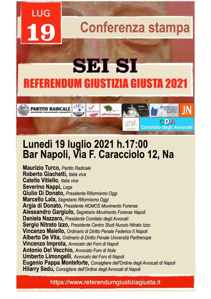 Napoli. Lunedi alle ore 17 presso il Bar Napoli in Via Caracciolo n 12, Maurizio Turco, segretario del Partito Radicale, Roberto Giachetti e Catello Vitiello di Italia Viva e Severino Nappi, consigliere Regionale della Lega, riuniti dall’Associazione Riformismoggi di Giulio Di Donato e Marcello Lala annunceranno in una conferenza stampa l’inizio della raccolta firme sui 6 requisiti referendari insieme ad Alessandro Gargiulo (Segretario del Movimento Forense Napoli), Argia Di Donato (Presidente di NOMOS Movimento Forense) Daniela Nazzaro (presidente del Comitato degli Avvocati) Sergio Nitrato Izzo ( Presidente del Centro Studi Nunzio Nitrato Izzo) Vincenzo Maiello (Ordinario di diritto Penale alla Federico II) Alberto De Vita (Ordinario di diritto Penale alla Università Parthenope) Vincenzo Improta, Antonio Del Vecchio e Umberto Limongelli (Avvocati del Foro di Napoli) Eugenio Pappa Monteforte e Hilary Sedu (Consiglieri dell’Ordine degli avvocati di Napoli).
