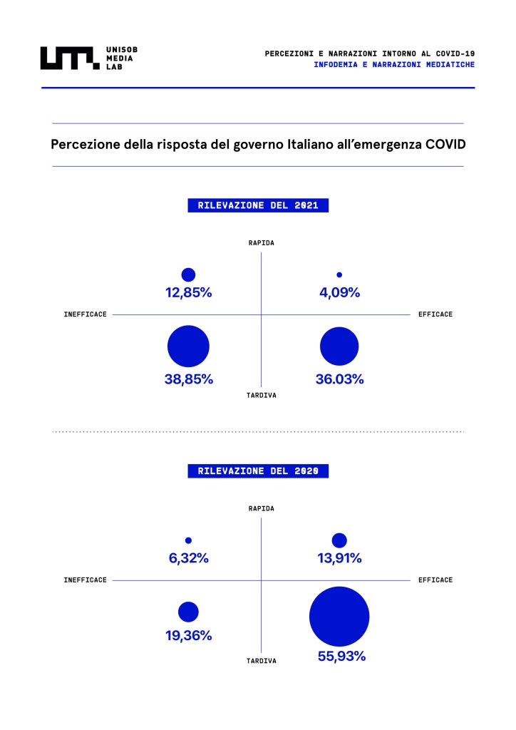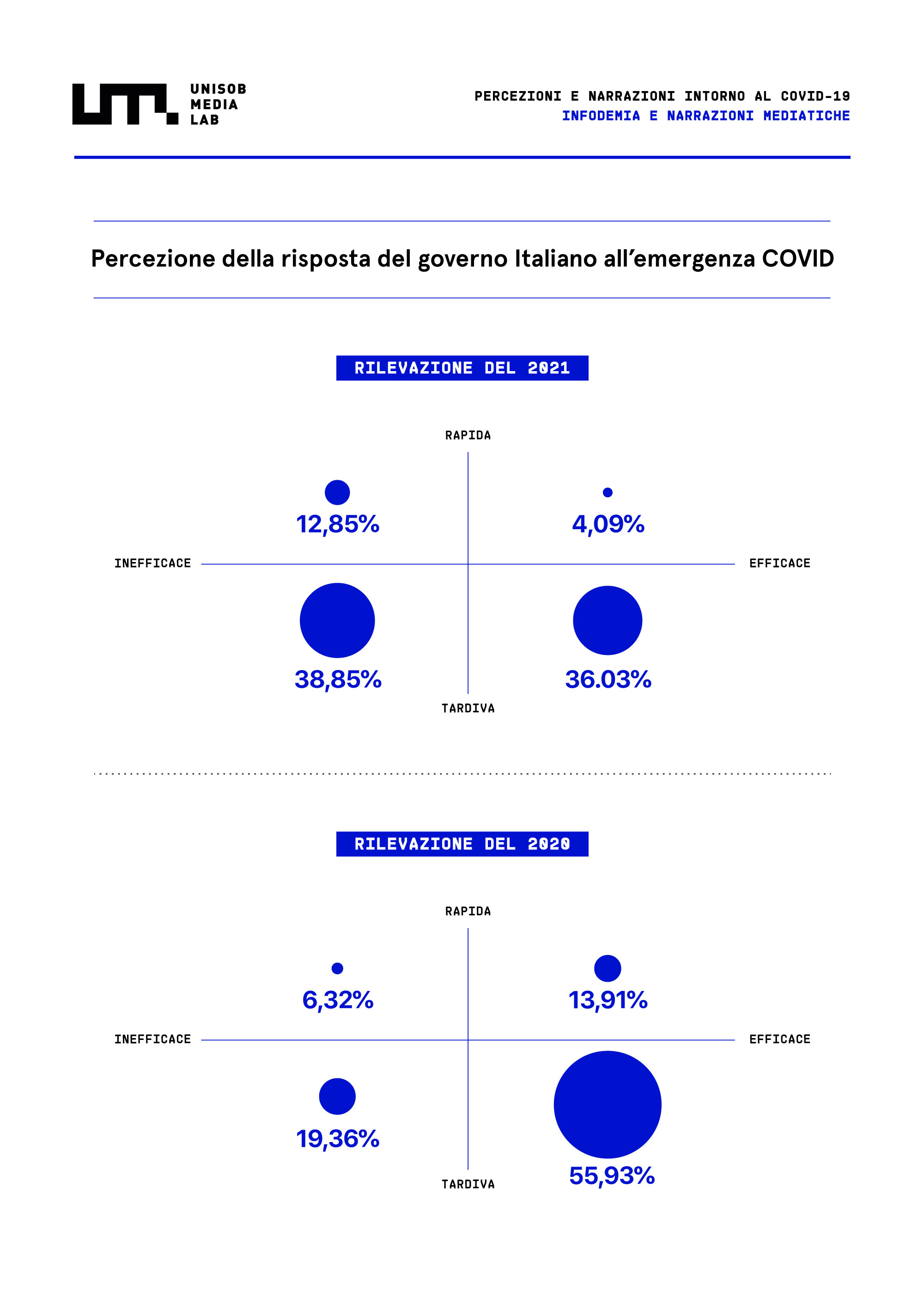 Altra convinzione mutata a causa delle influenze mediatiche è quella sull’importanza del tracciamento. Se nella prima fase della pandemia il 56,81% degli italiani riteneva necessario tracciare i movimenti dei cittadini attraverso app o smartphone per prevenire nuovi contagi dell’epidemia, circa un anno dopo la percentuale è scesa al 40,6%. Decisamente volubile anche l’idea sull’azione del governo italiano. Ad aprile 2020 per il 55,93% degli intervistati, l’Italia, con i decreti governativi, aveva risposto all’emergenza COVID-19 in maniera tardiva ma efficace. Dato crollato al 36,03% nella seconda rilevazione.