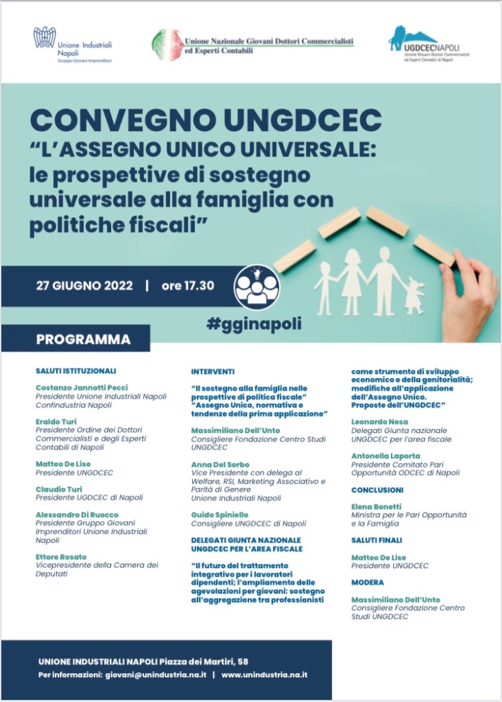 Lunedì 27 giugno 2022 alle ore 18 si terrà il convegno «L’assegno unico e le prospettive di sostegno universale alla famiglia con politiche fiscali» organizzato dall’UNGDCEC e dall’Unione Industriali Napoli – Gruppo Giovani Imprenditori.
