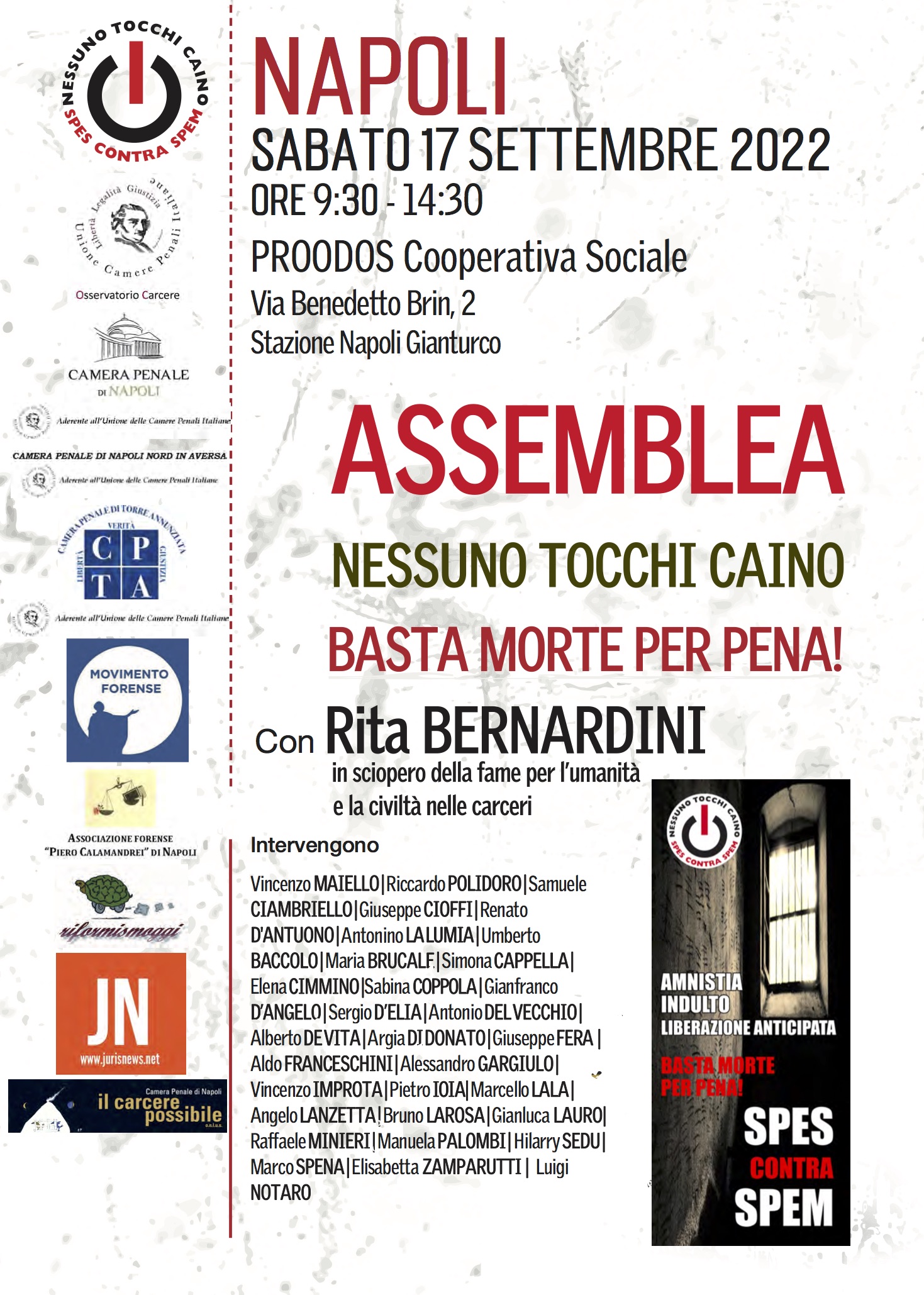 Sabato 17 settembre 2022, a partire dalle 9:30 e fino alle 14:30, presso la PROODOS Cooperativa Sociale in Via Benedetto Brin 2(Stazione Napoli Gianturco) si terrà un’Assemblea di Nessuno tocchi Caino-Spes contra Spem dal titolo “BASTA MORTE PER PENA!”.