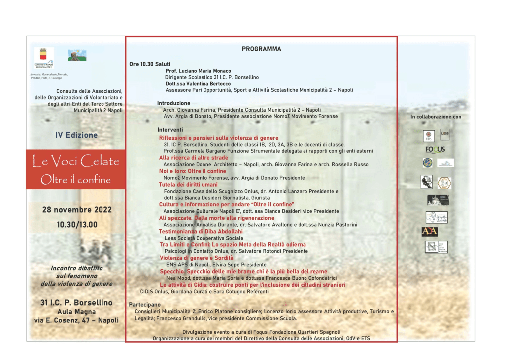 Da un’idea di NomoΣ Movimento Forense, la Consulta delle Associazioni, delle Organizzazioni di Volontariato e degli altri Enti del Terzo Settore Municipalità 2 Napoli presenta la IV edizione di “Voci Celate. Oltre il confine”. L’evento, aperto alla cittadinanza, patrocinato dalla Municipalità 2 del Comune di Napoli, si svolgerà lunedì 28 novembre, dalle ore 10:30 alle ore 13:00, presso l’Aula Magna del 31° I.C. Paolo Borsellino (Via E. Cosenz, 47 – Napoli, nei pressi di Piazza Garibaldi) e vedrà gli studenti del 31 I.C. P. Borsellino, protagonisti nel dialogo-confronto con i rappresentanti delle associazioni della Consulta delle Associazioni, delle Organizzazioni di Volontariato e degli altri Enti del Terzo Settore Municipalità 2 Napoli e le istituzioni locali nonché con professionisti, artisti e con la cittadinanza.