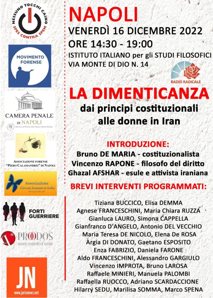 Non dobbiamo dimenticare. Questo è il leitmotiv dell’evento “La dimenticanza” dai pricipi costituzionali alle donne in Iran” che si svogerà a Napoli, venerdì 16 dicembre, dalle h. 14,30 alle 19.00, presso l’Istituto per gli Studi Filosofici (Palazzo Serra di Cassano, Via Monte di Dio, 14, NA) organizzato dalle Associazioni “Nessuno tocchi Caino“, “Movimento Forense“, “Camera Penale di Napoli“, “Piero Calamandrei di Napoli“, “Giovani iraniani in Italia“, “Forti Guerriere”, “Proodos Società Cooperativa Sociale” e con il supporto di “Radio Radicale” e “Juris News“.