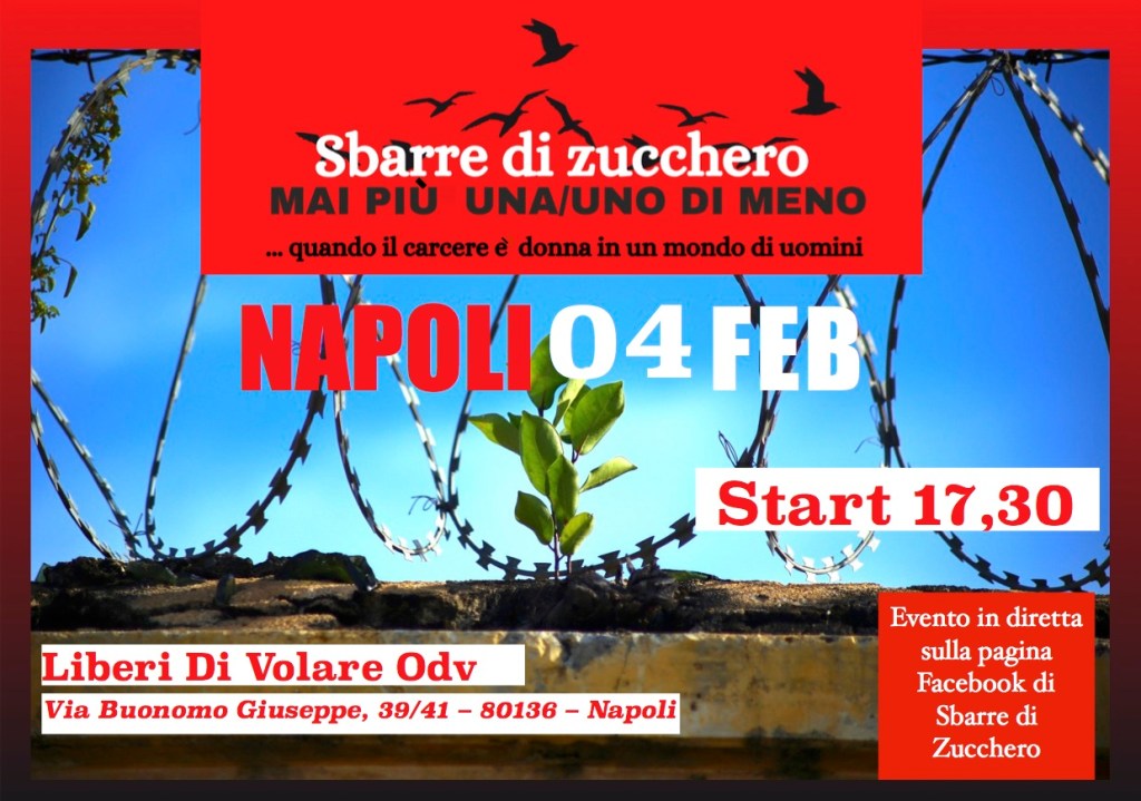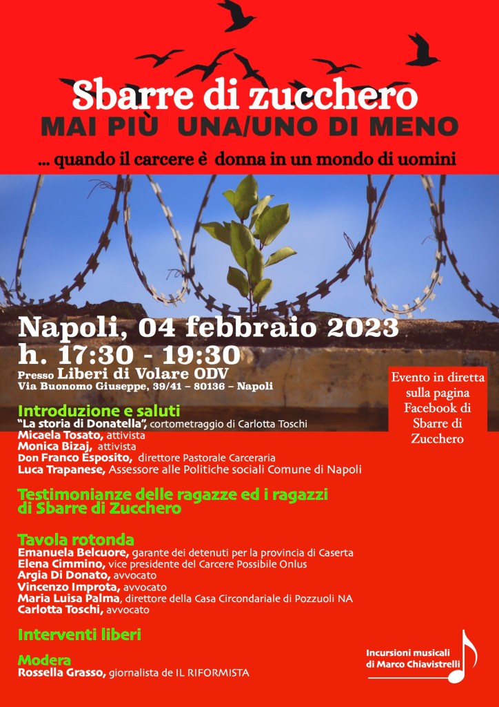 Ad aprire il convegno il cortometraggio di Carlotta Toschi e i saluti delle attiviste Micaela Tosato e Monica Bizaj, tra le fondatrici del gruppo Sbarre di Zucchero, e Don Franco Esposito, direttore Pastorale Carceraria. A seguire le testimonianze delle ragazze e dei ragazzi di Sbarre di Zucchero che racconteranno le loro storie di disagio e riscatto. Infine tavola rotonda moderata da Rossella Grasso, giornalista del Riformista con gli interventi di Emanuela Belcuore, garante dei detenuti per la provincia di Caserta, Elena Cimmino, vice presidente de “Il Carcere Possibile Onlus”, degli avvocati Argia Di Donato, Vincenzo Improta, Carlotta Toschi e della dott.ssa Maria Luisa Palma, direttore della Casa Circondariale di Pozzuoli. Per il Comune di Napoli porterà il suo saluto l’assessore al Welfare e politiche sociali Luca Trapanese. Al termine interventi liberi. Incursioni musicali del cantautoreMarco Chiavistrelli. L’evento sarà trasmesso in streaming sullapagina Facebook di Sbarre di Zucchero.