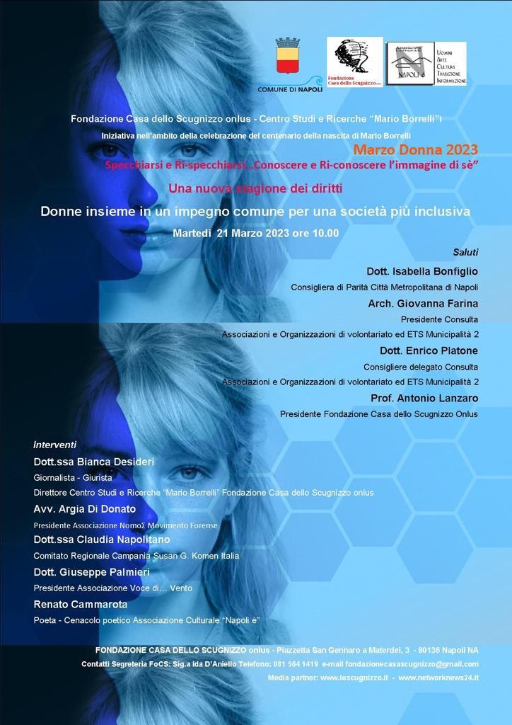 Nell’ambito delle iniziative di “Marzo Donna 2023 – Specchiarsi e Ri-specchiarsi…Conoscere e Ri-conoscere l’immagine di sé” dell’Assessorato alle Pari Opportunità del Comune di Napoli, si terrà martedì 21 marzo 2023 alle ore 10.00 presso la Sala “Mario Borrelli” della Fondazione Casa dello Scugnizzo onlus in piazzetta San Gennaro a Materdei n. 3, Napoli, la tavola rotonda “Una nuova stagione dei diritti: Donne insieme in un impegno comune per una società più inclusiva”.