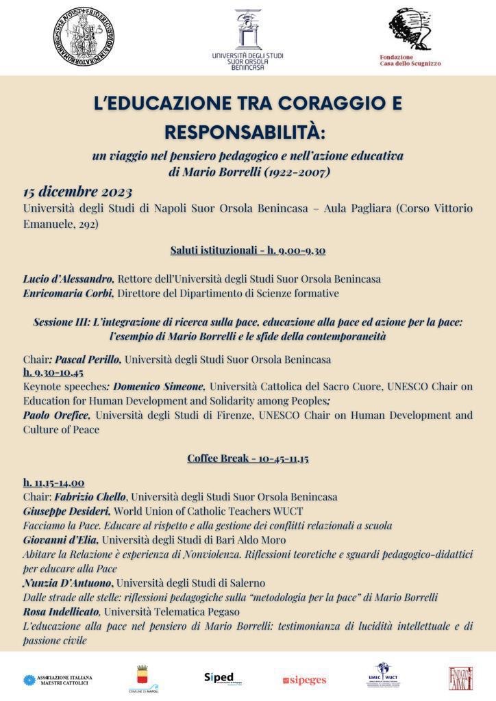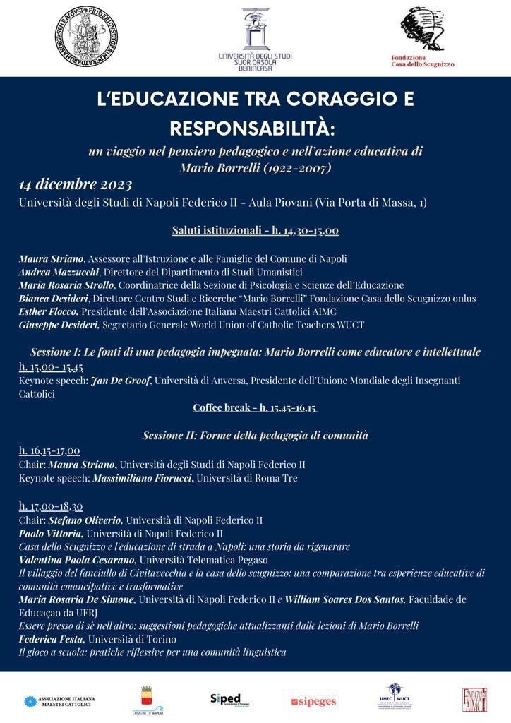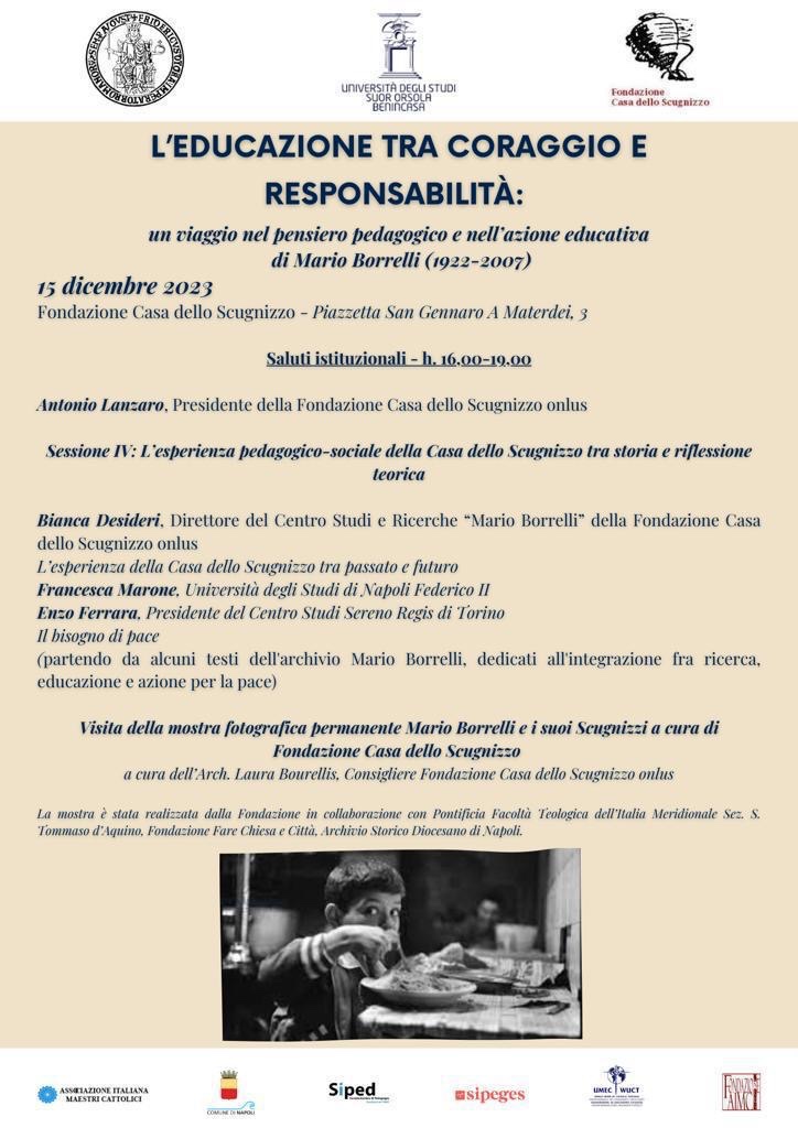 Giovedì 14 dicembre 2023 alle ore 14.30 presso l’Aula Piovani del Dipartimento di Studi Umanistici dell’Università degli Studi di Napoli Federico II, in Via Porta di Massa n. 1, si apriranno i lavori della due giorni di riflessione sulla figura di Mario Borrelli dal titolo “L’educazione tra coraggio e responsabilità: un viaggio nel pensiero pedagogico e nell’azione educativa di Mario Borrelli (1922-2007)”. Al fine di approfondire i temi che rappresentano la trama della riflessione pedagogica e politica di Mario Borrelli a cento e uno anni dalla sua nascita, la Fondazione Casa dello Scugnizzo onlus e il suo Centro Studi e Ricerche “Mario Borrelli”, l’Università degli Studi di Napoli Federico II, l’Università degli Studi Suor Orsola Benincasa, l’Associazione Italiana Maestri Cattolici, la World Union of CatholicTeachers e la Fondazione AIMC, con il patrocinio del Comune di Napoli, di Siped e Sipeges hanno organizzato un convegno che prevede due giornate di incontri, dibattiti, riflessioni per esplorare l’attualità del pensiero di Borrelli e dell’esperienza educativa della “Casa dello Scugnizzo”, ponendole in relazione alle sfide educative che ci pone la società contemporanea in termini di povertà educativa e disagio sociale.