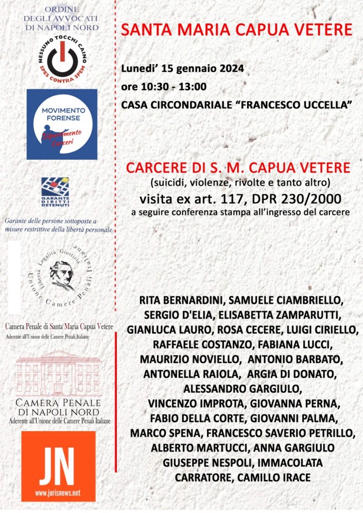 Lunedì 15 gennaio 2024 alle ore 10,30 si terrà una visita ex art. 117, DPR 230/2000, presso la Casa Circondariale ‘Francesco Uccella’ di Santa Maria Capua Vetere (CE).