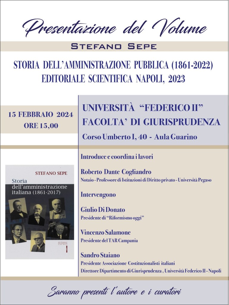 Napoli. Giovedì 15 febbraio, presso l’Aula Guarino della Facoltà di Giurisprudenza, a partire dalle h. 15,00, “Federico II” si svolgerà la presentazione del volume “Storia dell’amministrazione italiana (1861-2017)” di Stefano Sepe (Editoriale Scientifica Edizioni).