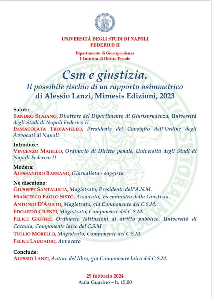 Napoli. Giovedì 29 febbraio, a partire dalle h. 15,00 presso l’Università Federico II, Dipartimento di giurisprudenza, si svolgerà la presentazione del libro “CSM e giustizia. Il possibile rischio di un rapporto asimmetrico” (Mimesis Edizioni 2023) di Alessio Lanzi.