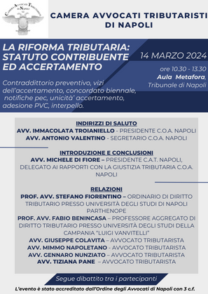 I temi trattati saranno la riforma dello Statuto del Contribuente, le modifiche al contraddittorio endo-procedimentale, il nuovo accertamento tributario, la nullità e l’annullabilità degli atti ed altri. L’incontro, con i saluti di Immacolata Troianiello, Presidente C.O.A. Napoli, Antonio Valentino, Segretario C.O.A. Napoli, e l’introduzione di Michele Di Fiore, Presidente C.A.T. Napoli, Delegato Ai Rapporti Con La Giustizia Tributaria C.O.A., Napoli, prevede gli interventi di Stefano Fiorentino, Ordinario Di Diritto Tributario Presso Università Degli Studi Di Napoli Parthenope, Fabio Benincasa, Professore Aggregato Di Diritto Tributario presso Università Degli Studi Della Campania “Luigi Vanvitelli”, di Giuseppe Colavita, Avvocato Tributarista, di Mimmo Napoletano, Avvocato Tributarista, di Gennaro Nunziato, Avvocato Tributarista e di Tiziana Pane, Avvocato Tributarista.