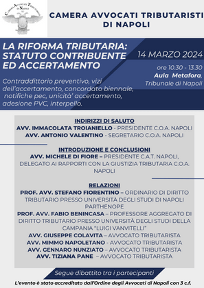 Si svolgerà giovedì 14 marzo, dalle h. 10.30 alle 13,30, presso l’aula Metafora del Tribunale di Napoli, il Convegno organizzato dalla Camera degli Avvocati tributaristi di Napoli “La riforma tributaria: lo Statuto del Contribuente, autotutela e accertamento“.