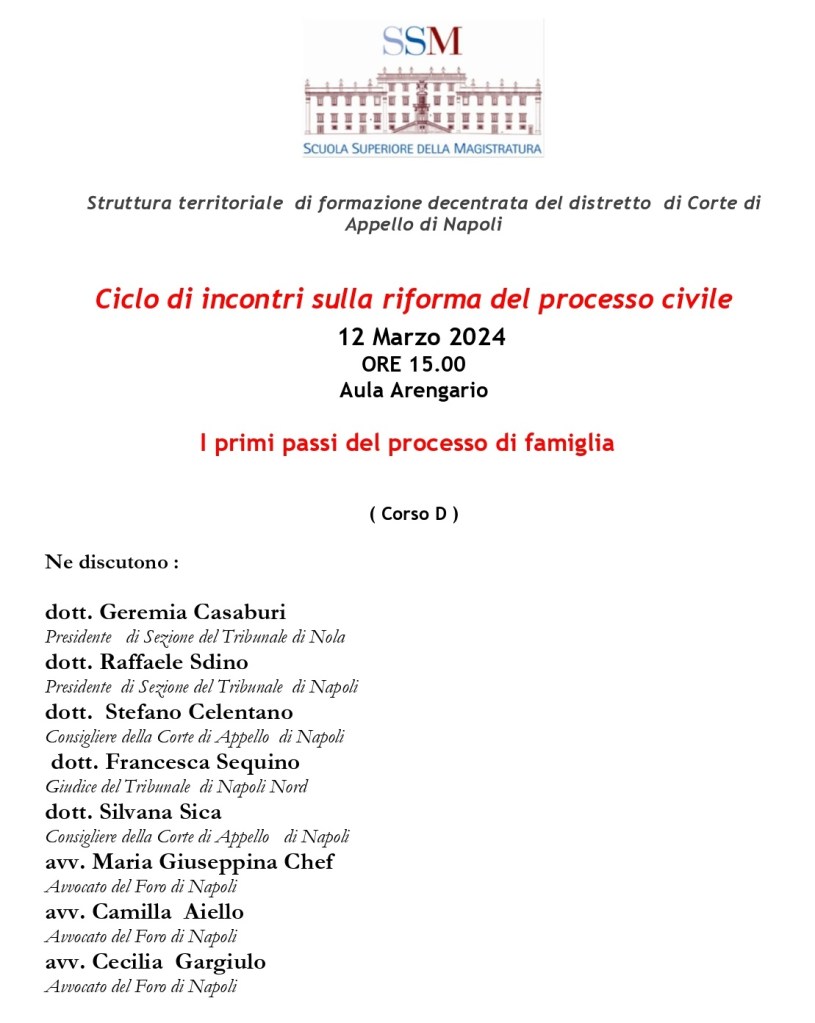 L’incontro moderato da Geremia Casaburi, Presidente di Sezione del Tribunale di Nola e da Raffaele Sdino, Presidente di Sezione del Tribunale di Napoli, prevede gli interventi di Stefano Celentano, Consigliere della Corte di Appello di Napoli, di Francesca Sequino, Giudice del Tribunale di Napoli Nord, di Silvana Sica, Consigliere della Corte di Appello di Napoli, di Maria Giuseppina Chef, Avvocato del Foro di Napoli già Consigliere dell’Ordine degli Avvocati di Napoli e delegata alla famiglia, di Camilla Aiello, Avvocato del Foro di Napoli e coordinatrice della Commissione famiglia presso l’Ordine degli Avvocati di Napoli e di Cecilia Gargiulo, Avvocato del Foro di Napoli e Coordinatrice della Commissione Minori presso l’Ordine degli Avvocati di Napoli.