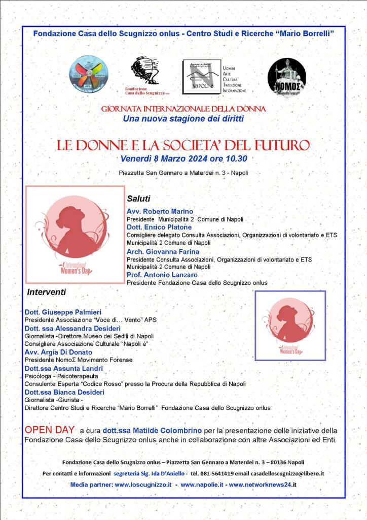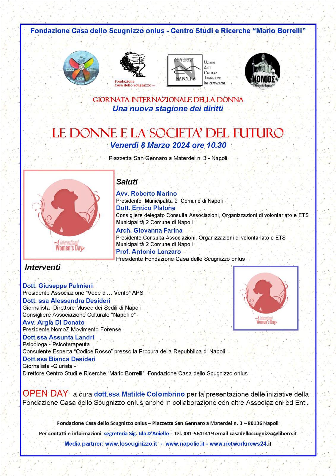 Venerdì 8 marzo 2024 alle ore 10.30, in occasione della “Giornata internazionale della Donna” e del Marzo Donna 2024, la Fondazione Casa dello Scugnizzo onlus – Centro Studi e Ricerche “Mario Borrelli”, in piazzetta San Gennaro a Materdei n. 3, Napoli, presieduta dal prof. Antonio Lanzaro, organizza un incontro di informazione e formazione dal titolo “Una nuova stagione di diritti: Le Donne e la Società del futuro”.