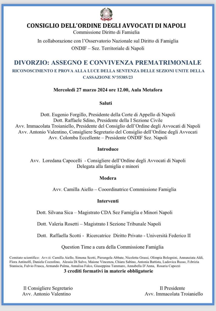 Mercoledì 27 marzo, a partire dalle h. 12:00 presso l’Aula Metafora del Nuovo Palazzo di Giustizia, si svolgerà il primo degli eventi formativi a cura della Commissione Diritto di Famiglia presso l’Ordine degli Avvocati di Napoli, dal titolo “Divorzio: assegno e convivenza prematrimoniale- Riconoscimento e prova alla luce della sentenza delle Sezioni Unite della Cassazione n. 35385/2023”.