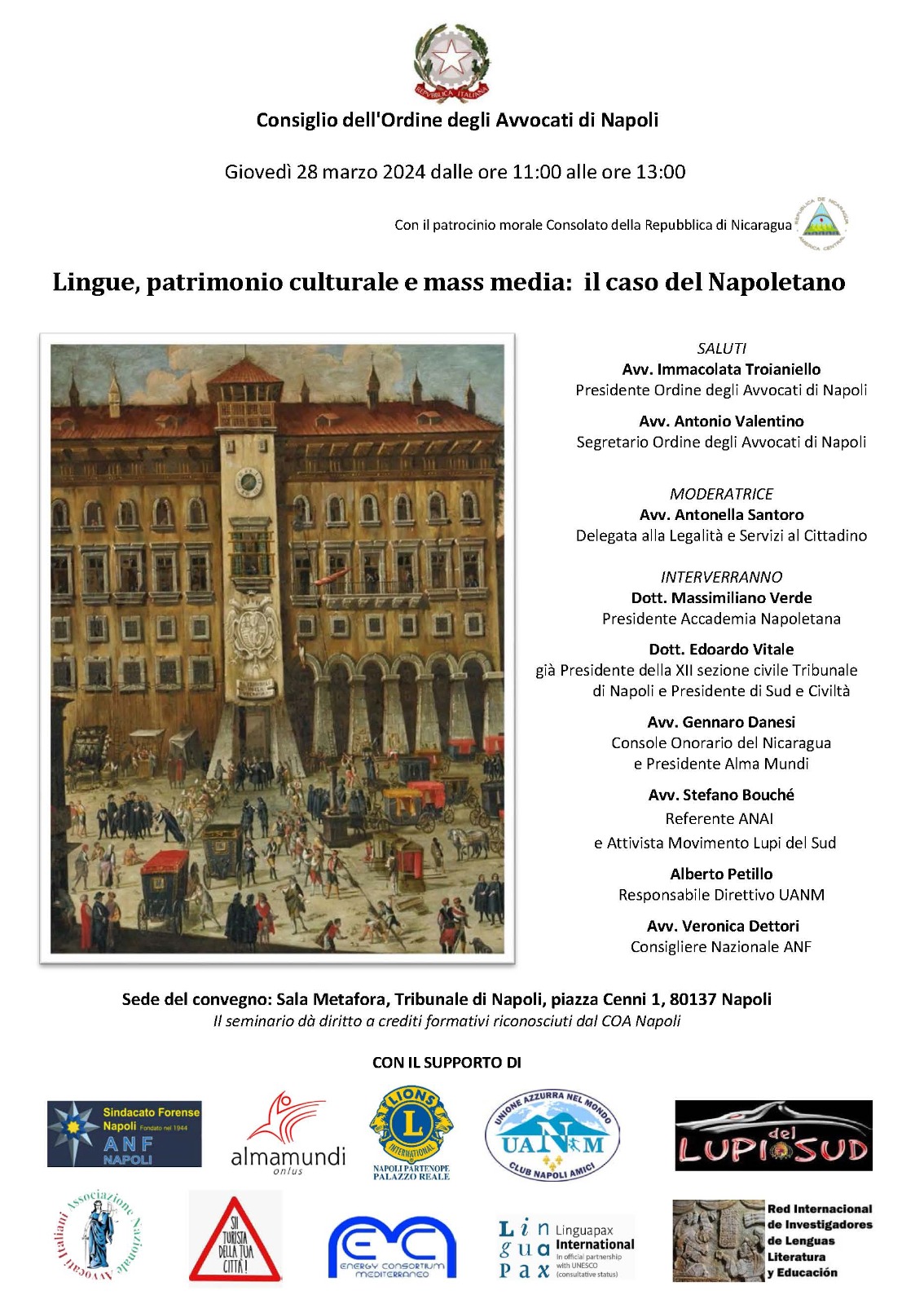 Napoli. Giovedì 28 marzo, a partire h. 11:00, presso il Nuovo Palazzo di Giustizia, Aula Metafora, si terrà il Convegno, organizzato dall’Accademia Napoletana, in collaborazione con il Consiglio dell’Ordine degli Avvocati di Napoli e il patrocinio morale del Consolato della Repubblica di Nicaragua, “Lingue, patrimonio culturale e mass-Media: il caso del Napoletano“.