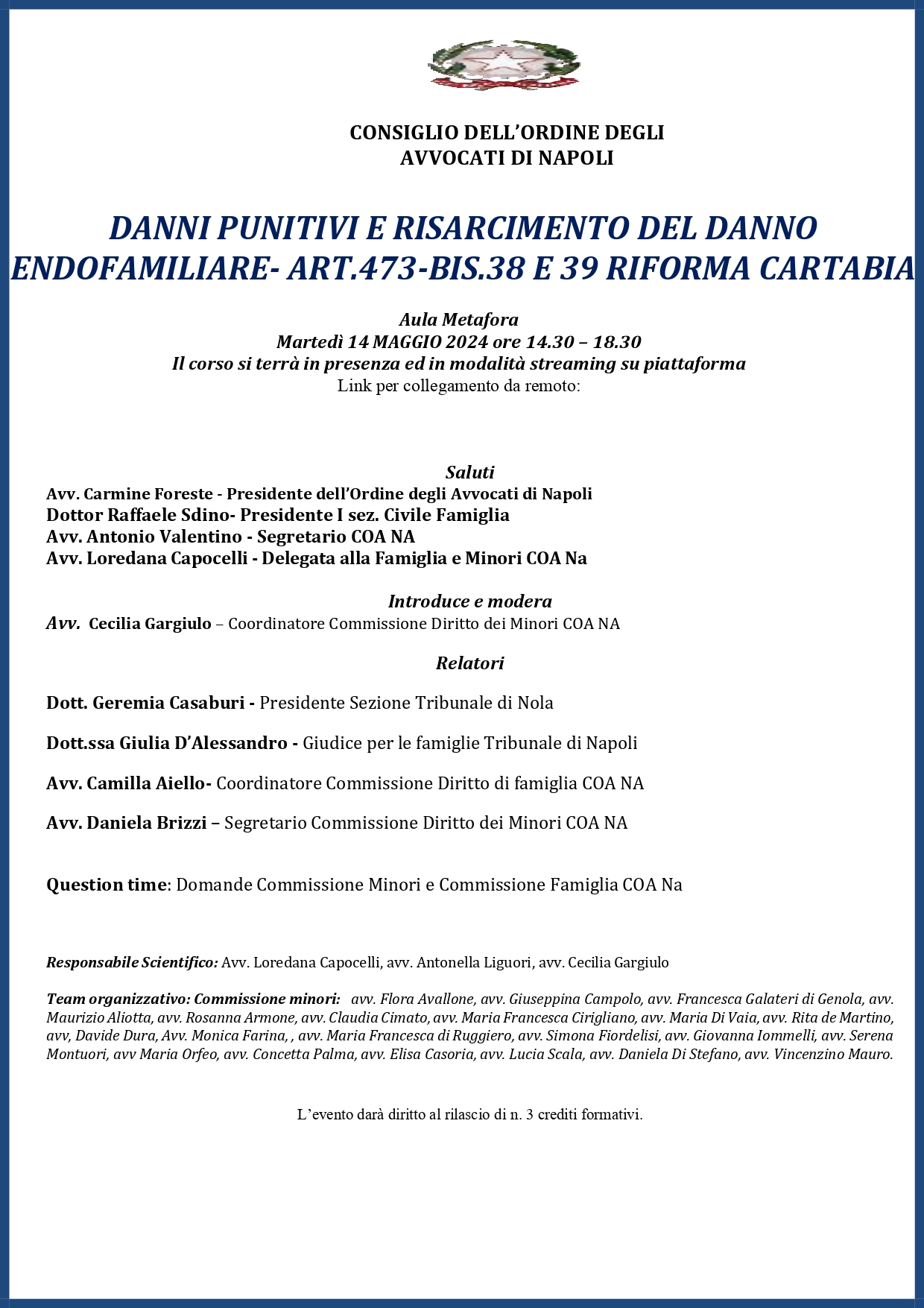 Napoli. Martedì 14 maggio, a partire dalle ore 14,30 si svolgerà l’incontro organizzato dalla Commissione Minori del Consiglio dell’Ordine degli Avvocati di Napoli “Danni punitivi e risarcimento del danno endofamiliare – Art. 473 bis 38 e 39 Riforma Cartabia”.