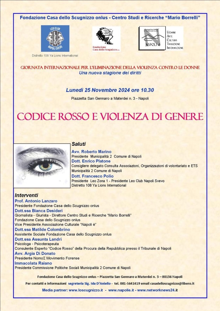Lunedì 25 novembre 2024 alle ore 10.30, in occasione della “Giornata internazionale per l’eliminazione della violenza contro le donne” la Fondazione Casa dello Scugnizzo onlus – Centro Studi e Ricerche “Mario Borrelli”, in piazzetta San Gennaro a Materdei n. 3, Napoli, e l’Associazione Culturale “Napoli è” organizzano un incontro di informazione e formazione dal titolo “Codice rosso e violenza di genere”.