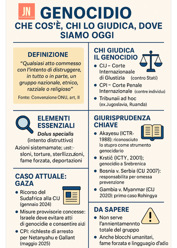 Fonti normative e giurisprudenziali: (Convenzione ONU per la prevenzione e repressione del crimine di genocidio (1948) Statuto della Corte Penale Internazionale, art. 6 CIJ, Bosnia v. Serbia, Sentenza del 26 febbraio 2007 CIJ, South Africa v. Israel, Ordinanza sulle misure provvisorie, 26 gennaio 2024 CPI, Richiesta di mandati di arresto contro Netanyahu e Gallant, maggio 2025)