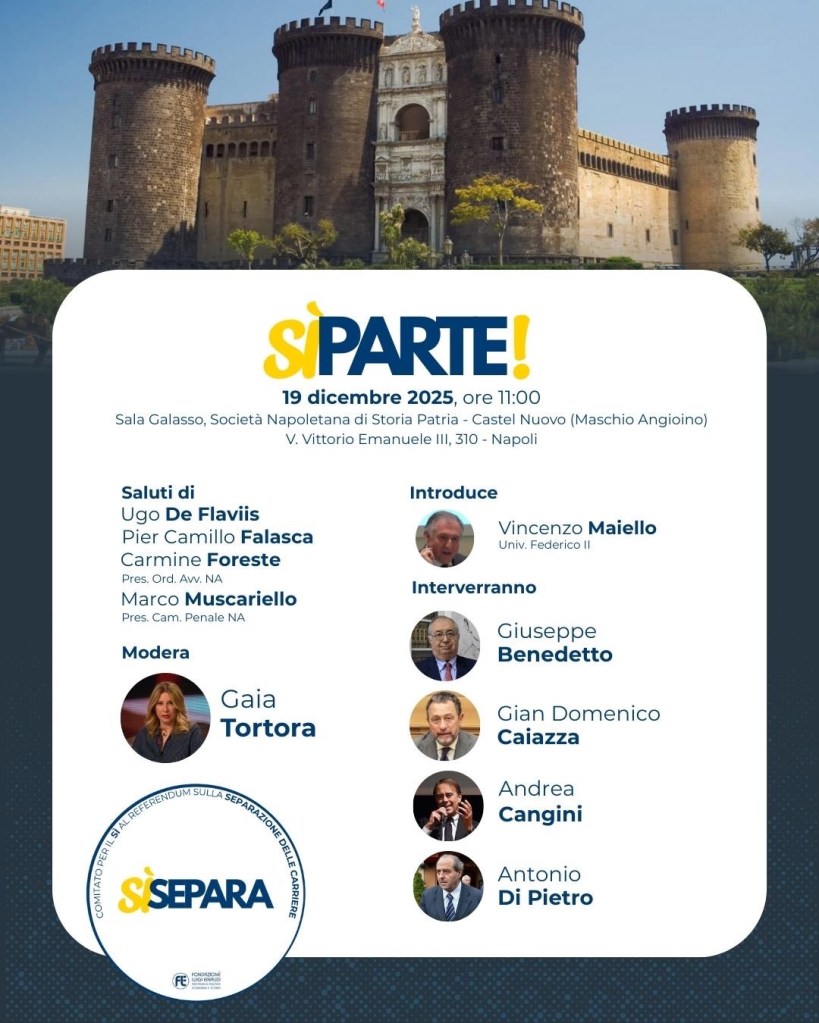 Napoli. Quest’oggi, 19 dicembre 2025, nella Sala Galasso della Società Napoletana di Storia Patria, presso Castel Nuovo, si è svolta l’iniziativa “Sì parte!”, promossa dal Comitato Sì Separa, nell’ambito del dibattito pubblico sul referendum relativo alla separazione delle carriere tra magistratura giudicante e requirente.